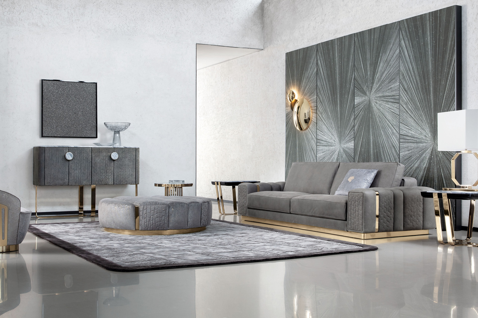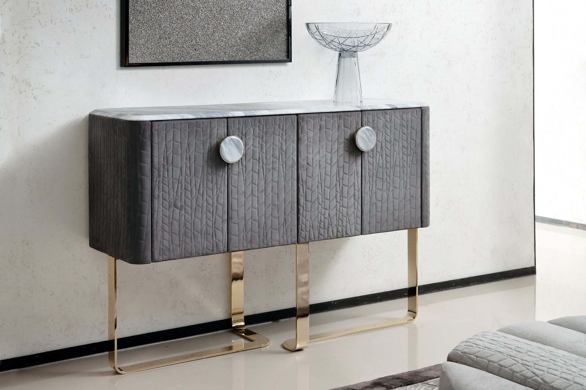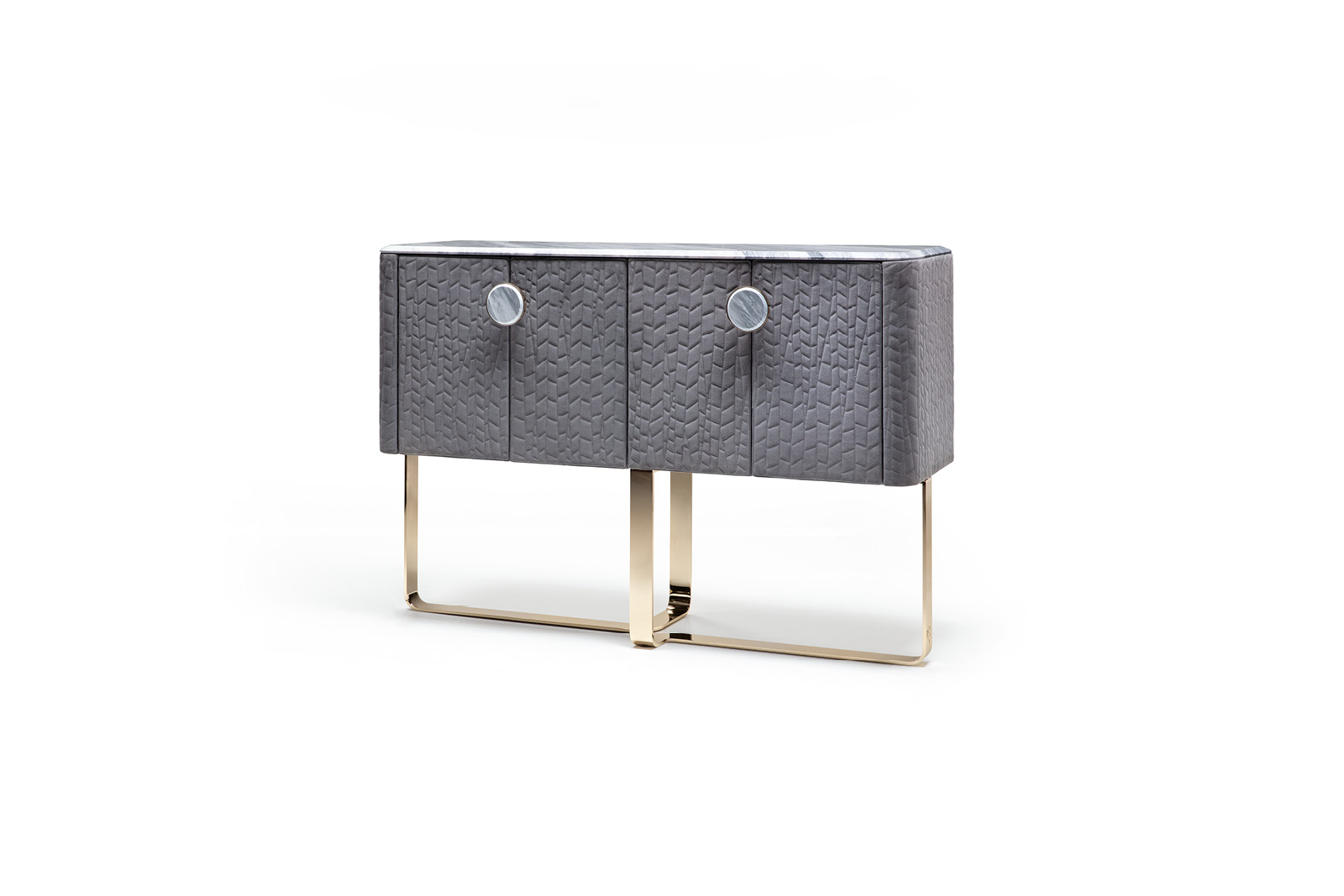 Bar for living room in quilted grey nubuk color nr 6. 2 double sliding doors with 2 big handles in combination of beveled marble and light gold chrome stainless steel. Top in beveled marble.