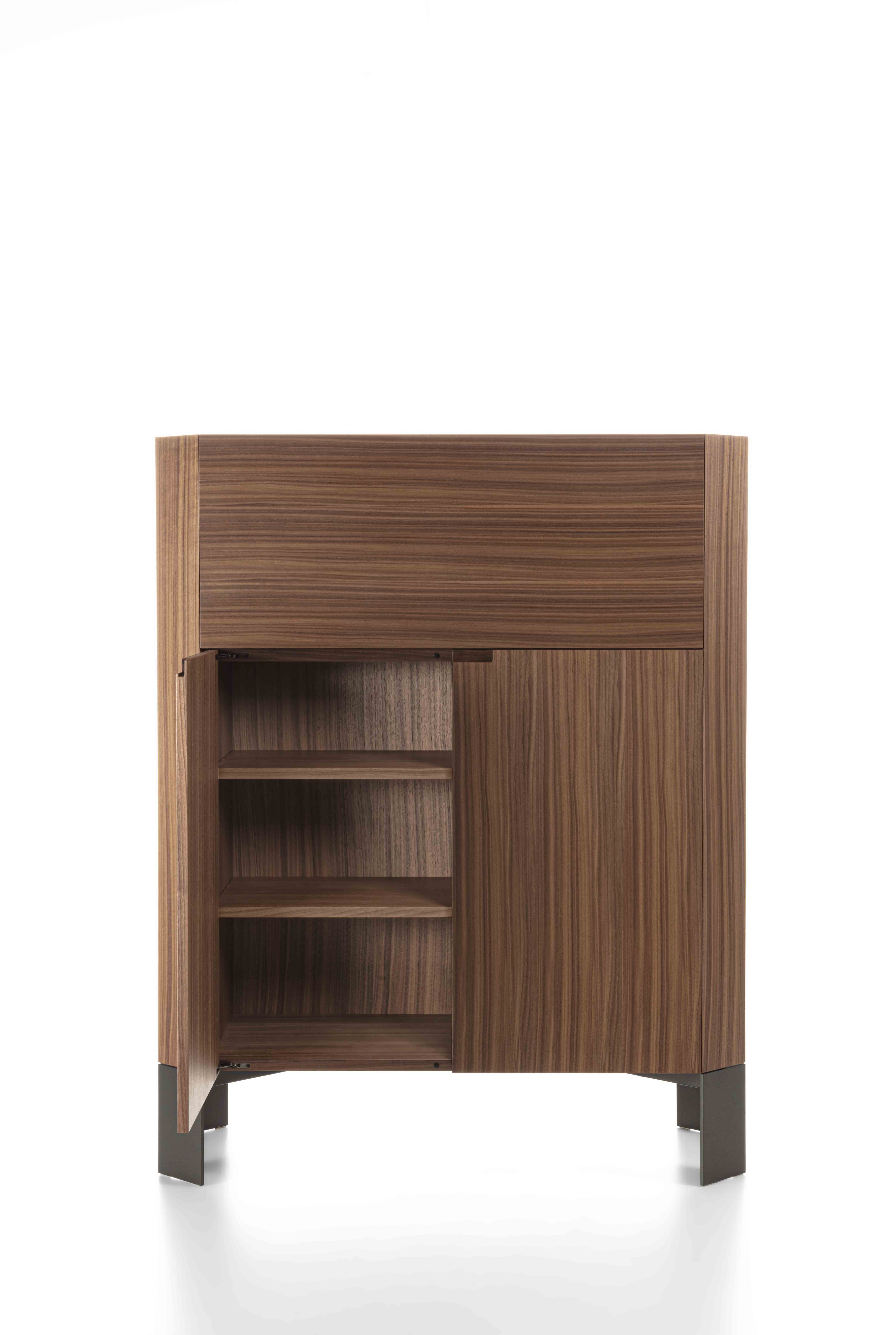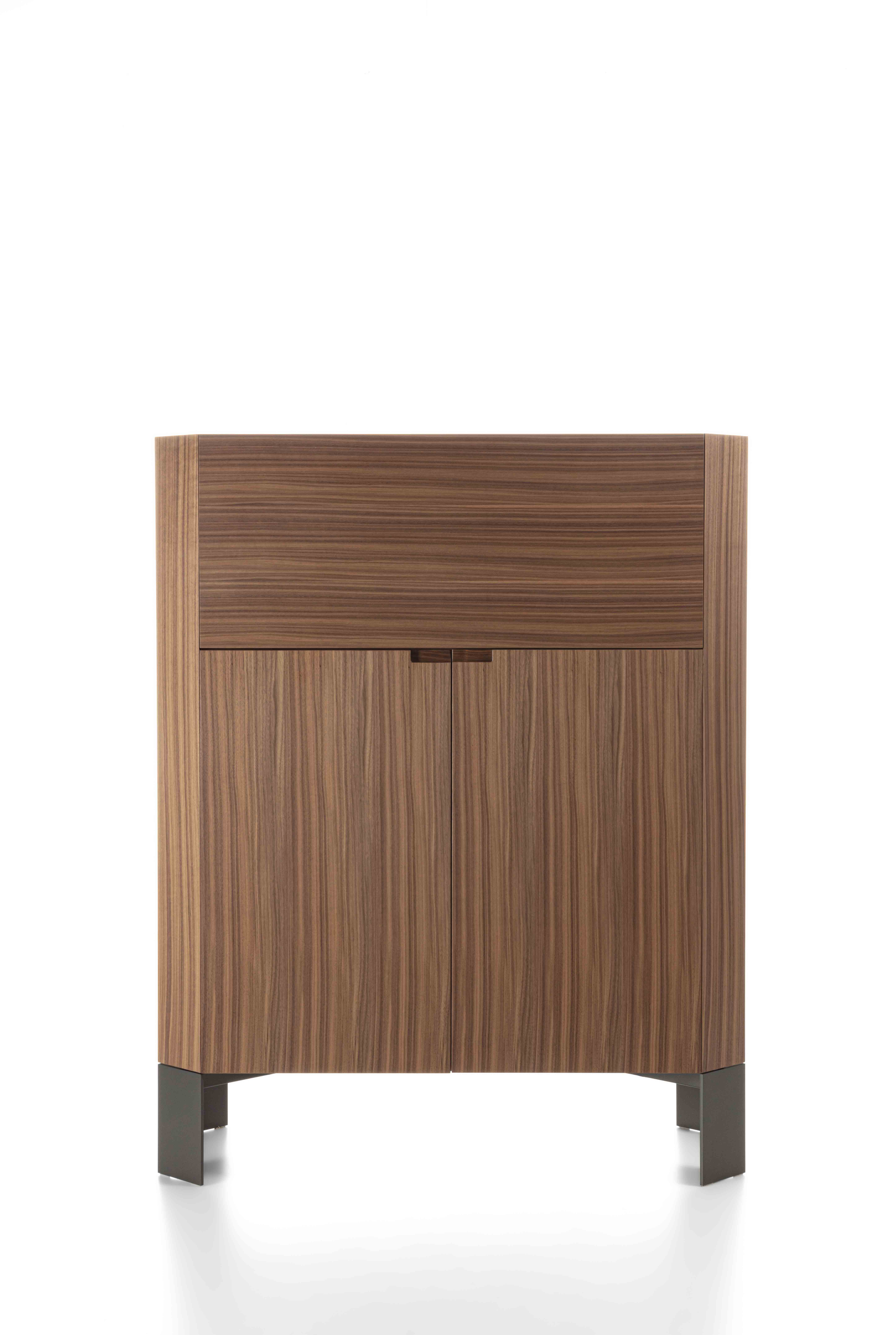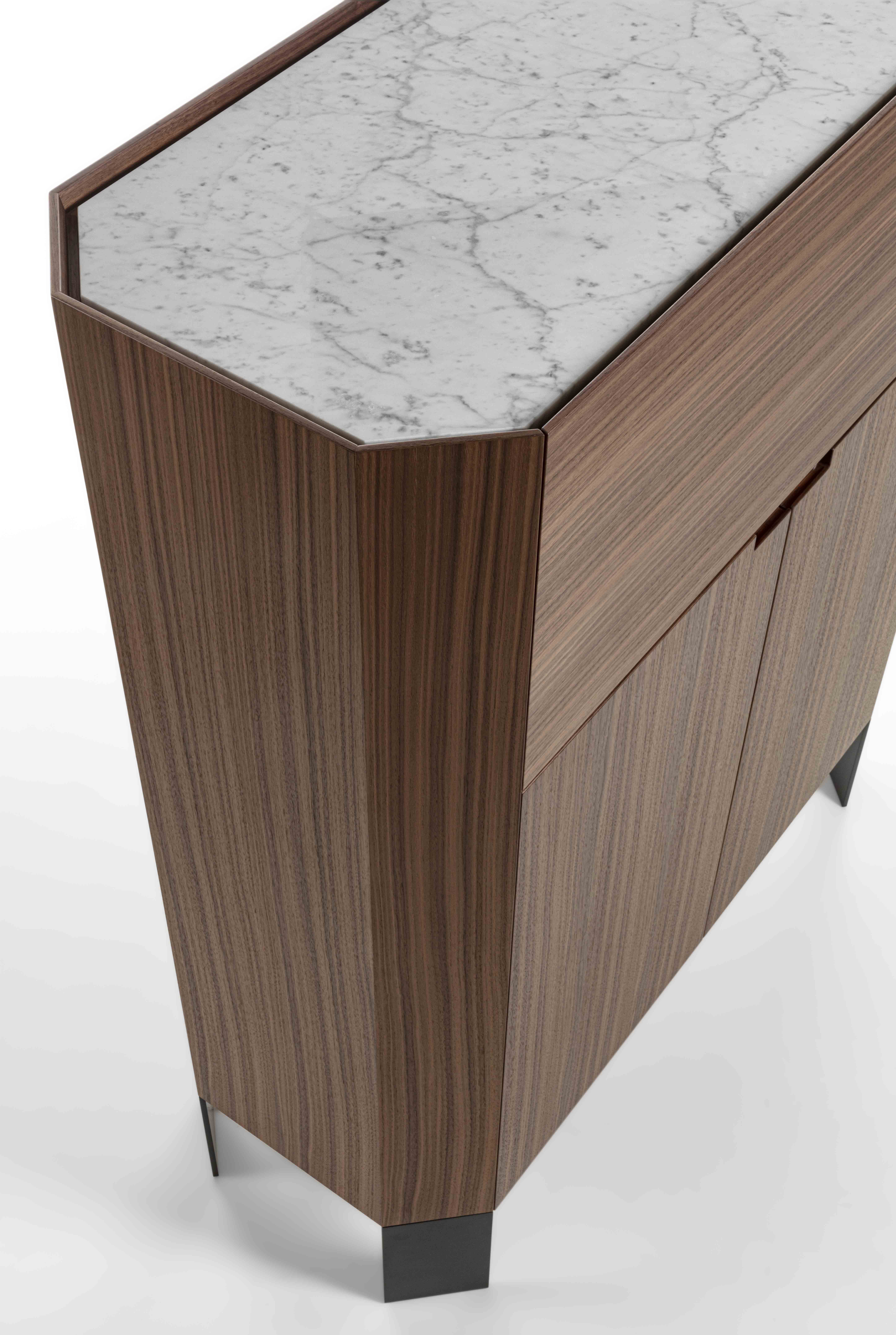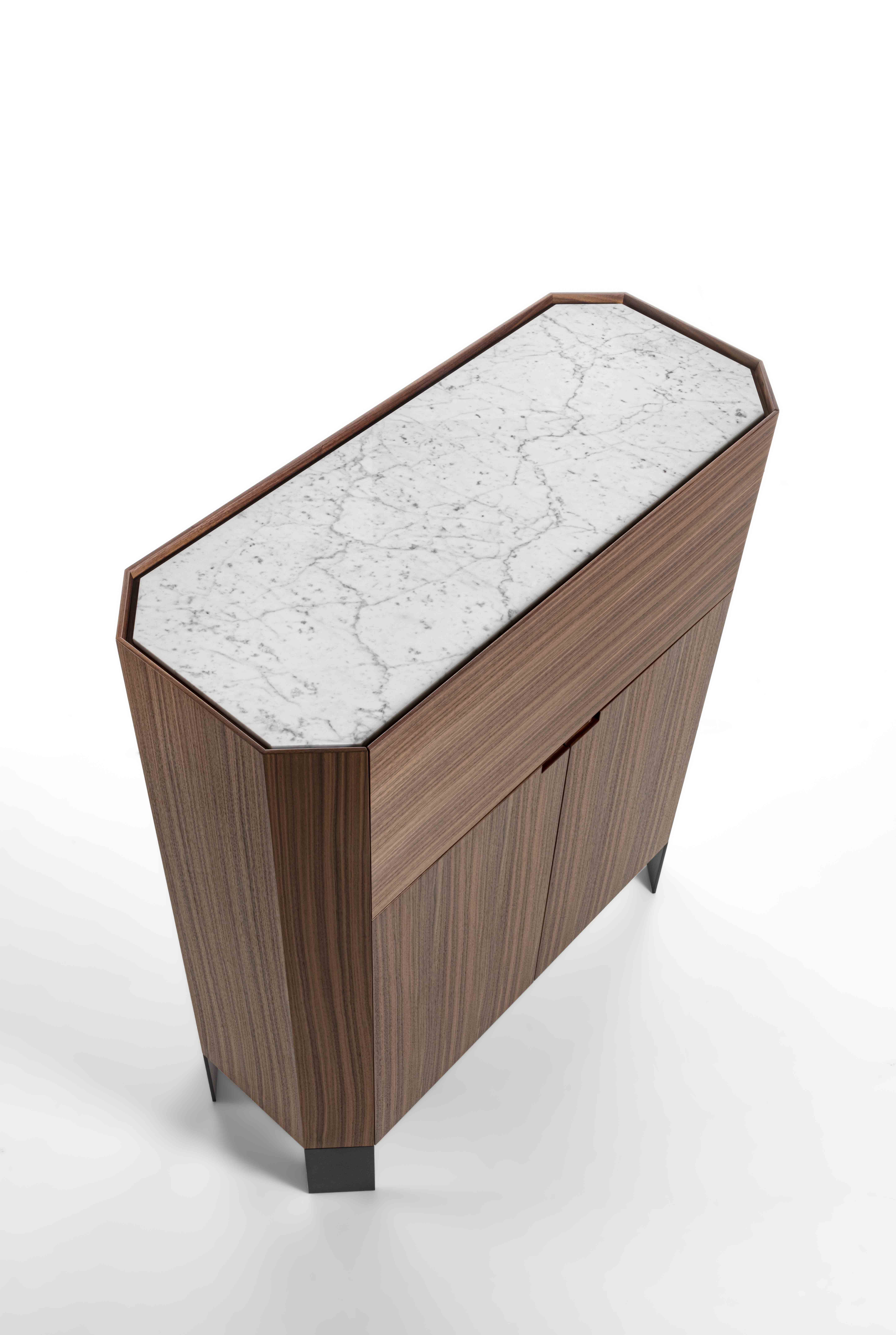 Storage unit with wooden doors and/or flap and marble or wooden top. The base is in metal and the internal division is characterized by wooden shelves.