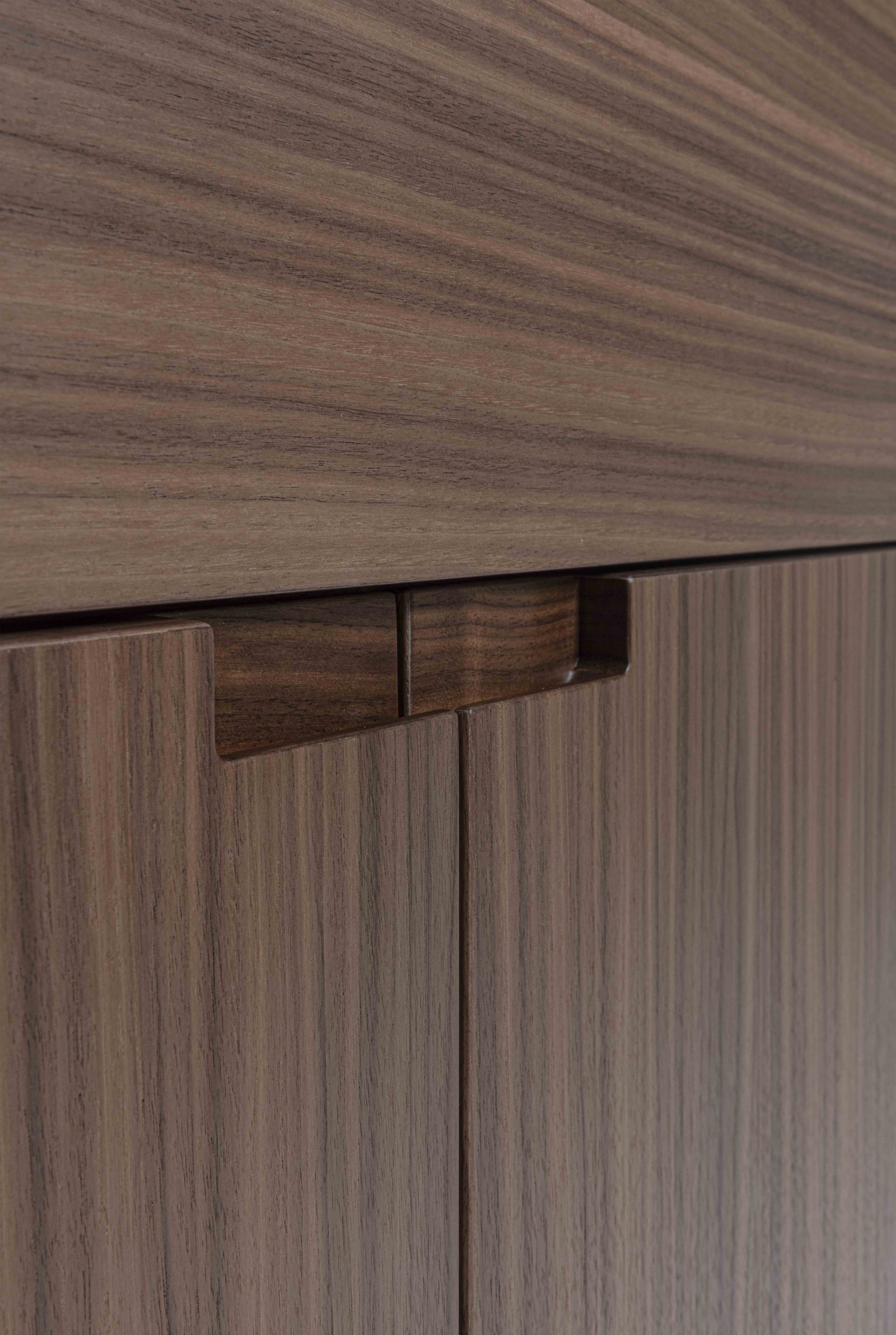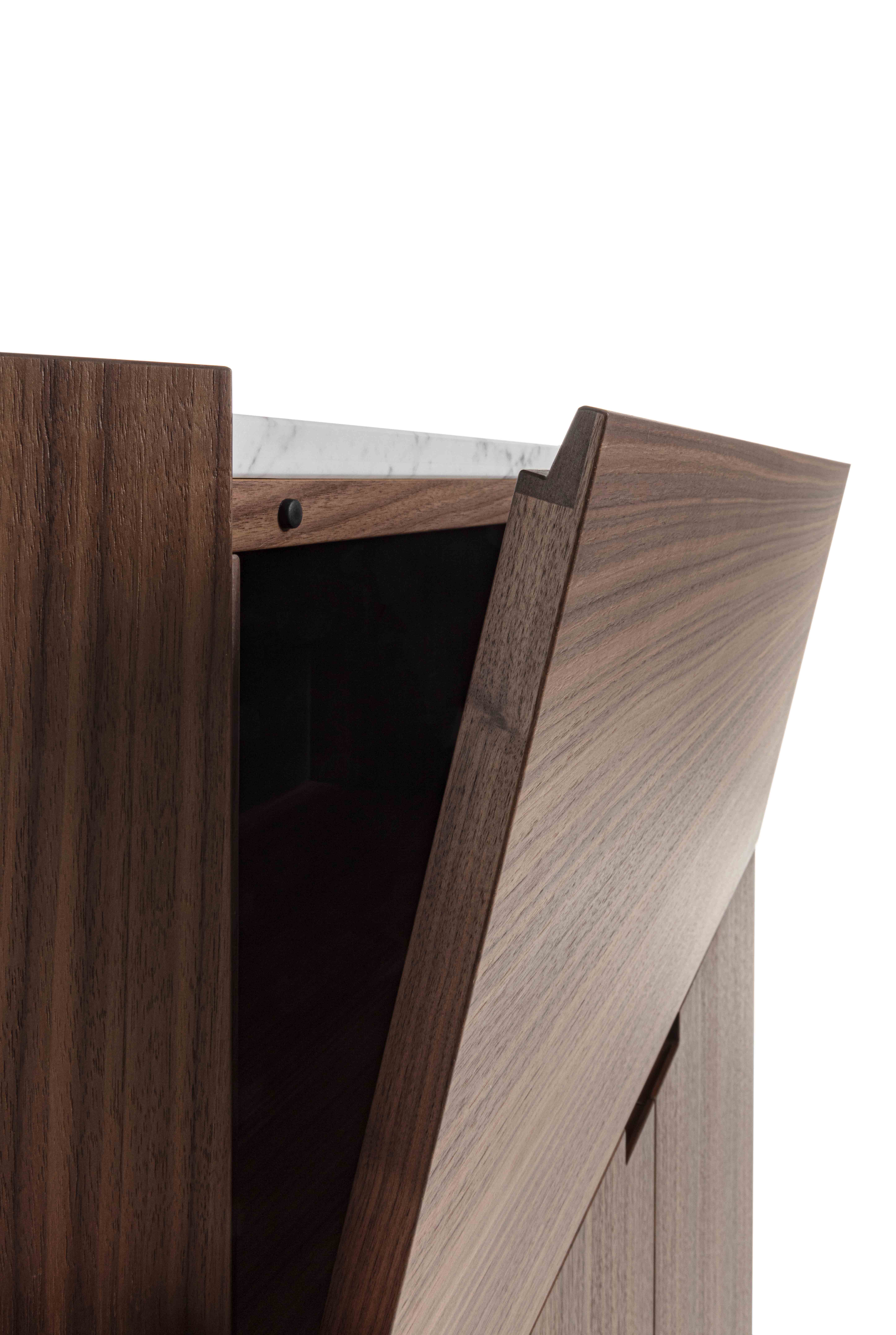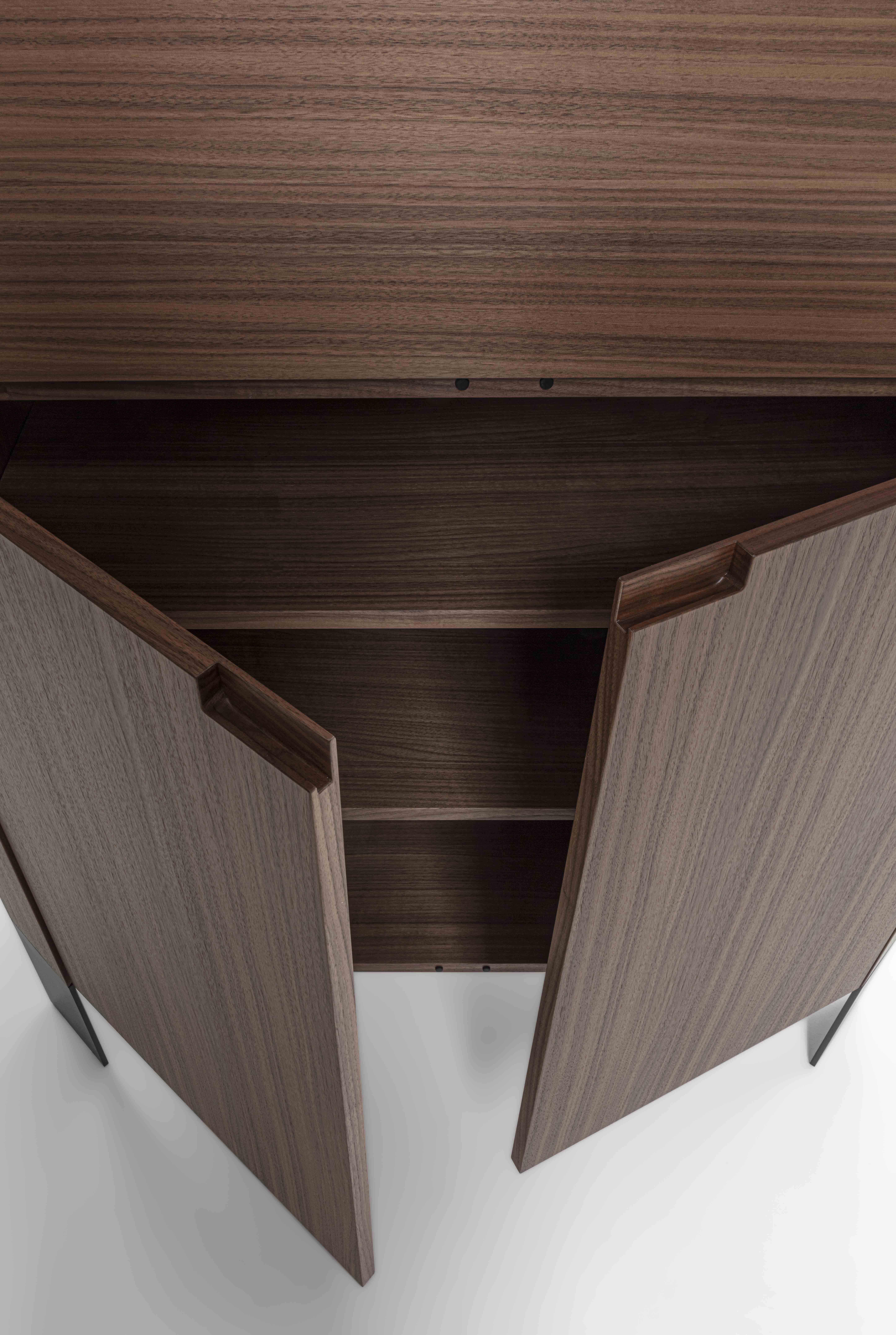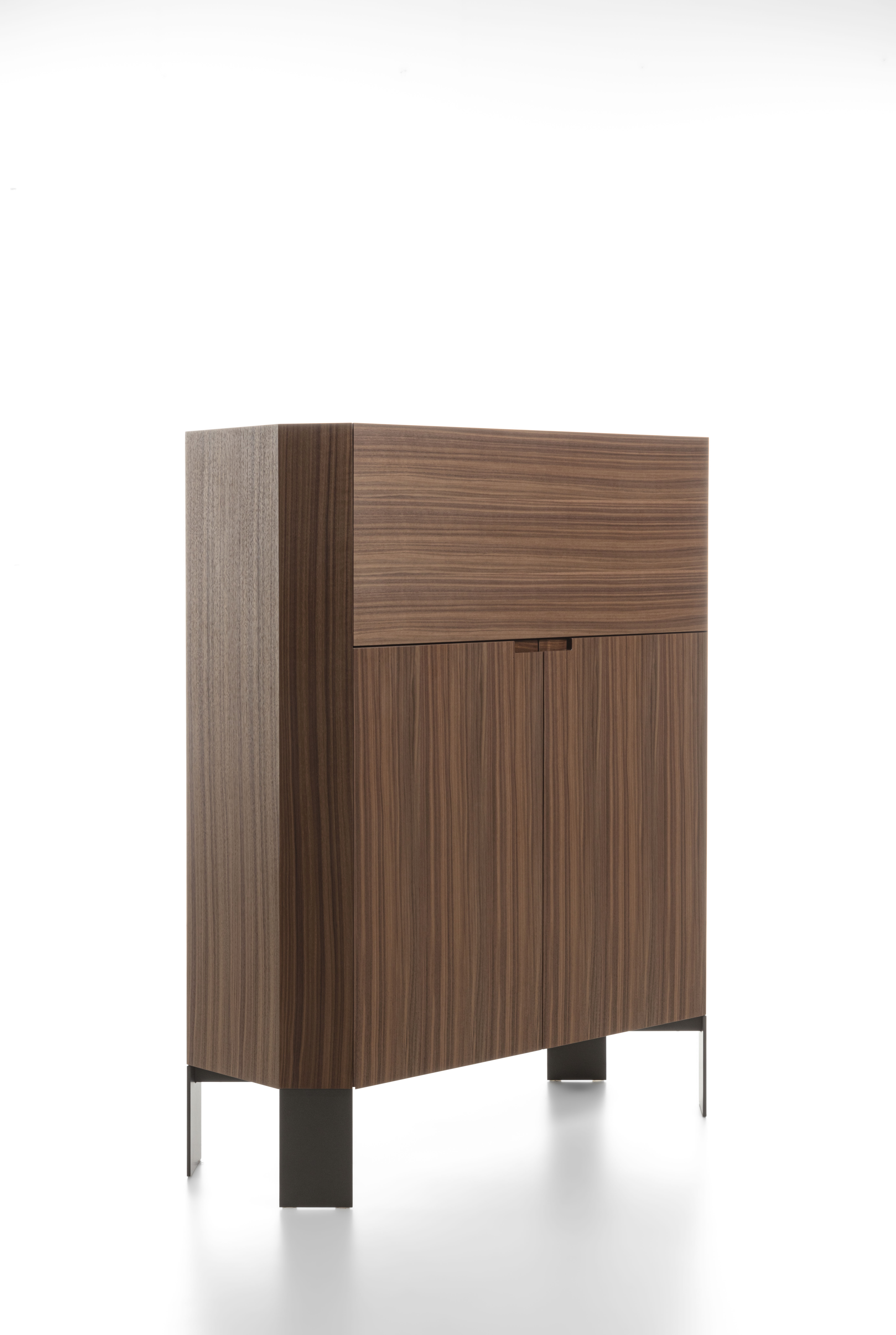 Storage unit with wooden doors and/or flap and marble or wooden top. The base is in metal and the internal division is characterized by wooden shelves.