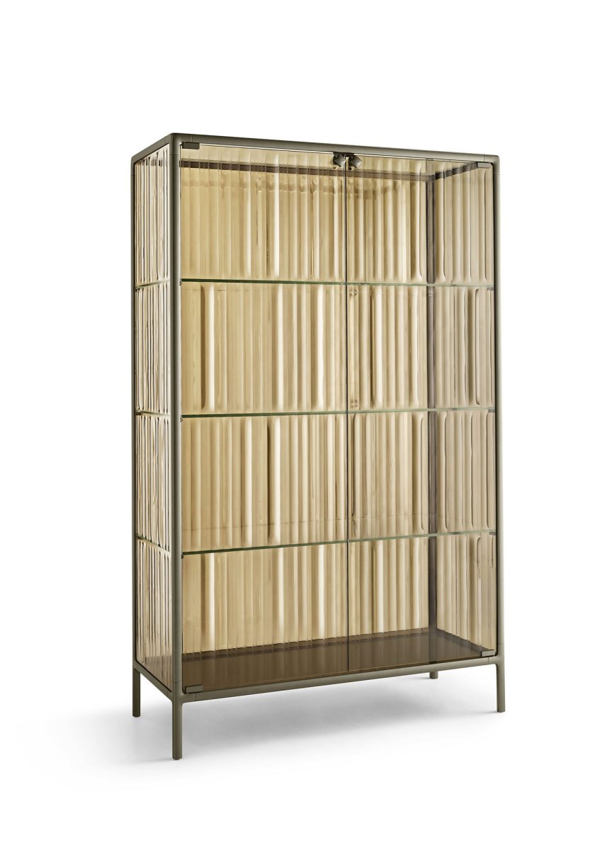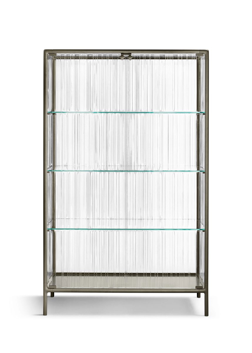 Vetrina con struttura in alluminio verniciato, disponibile nelle finiture Champagne Metallizzato, Greige Metallizzato e Grigio Vulcano.