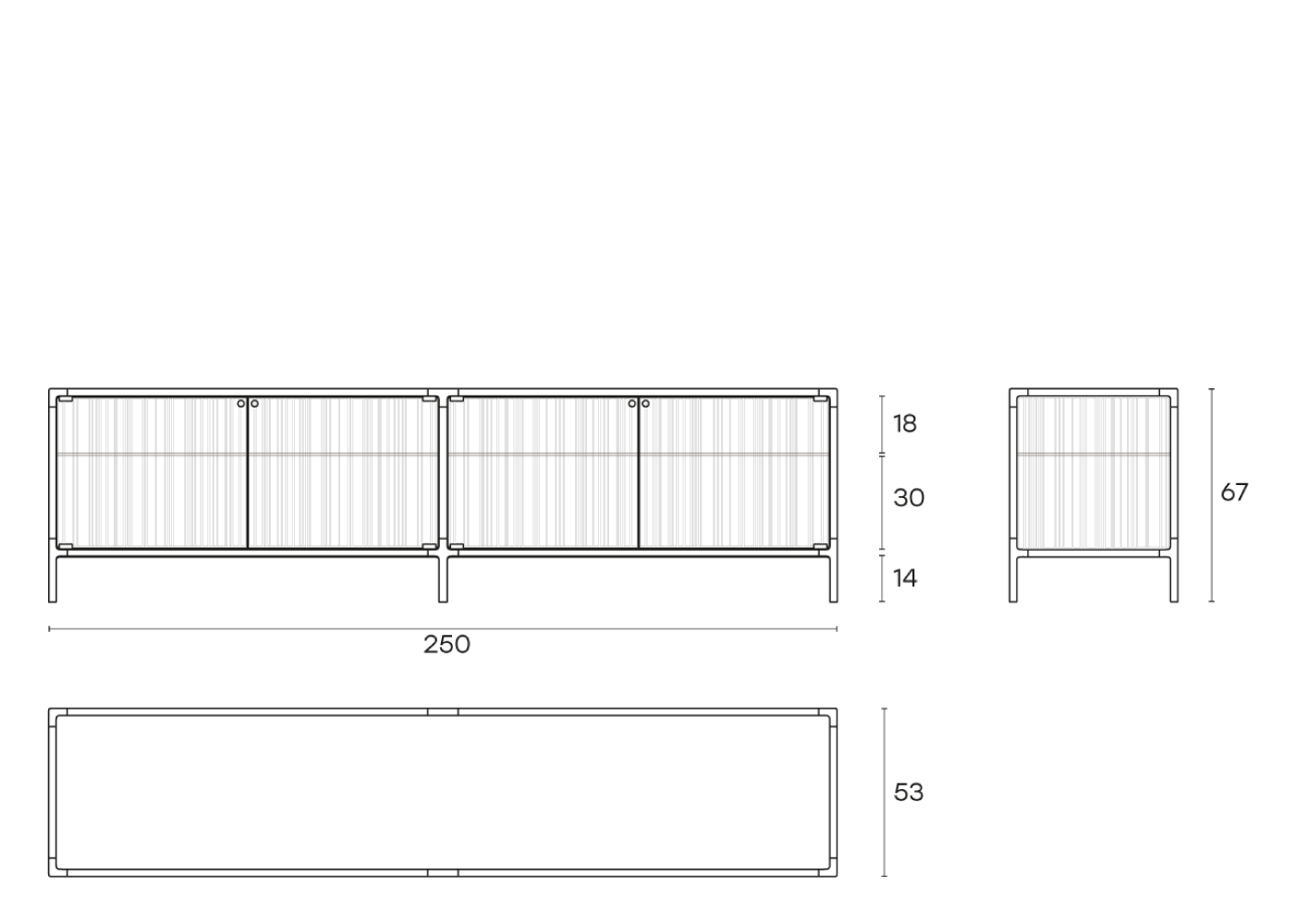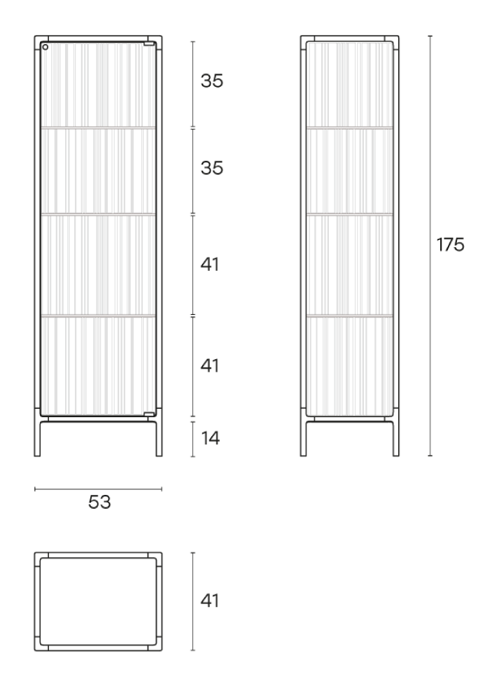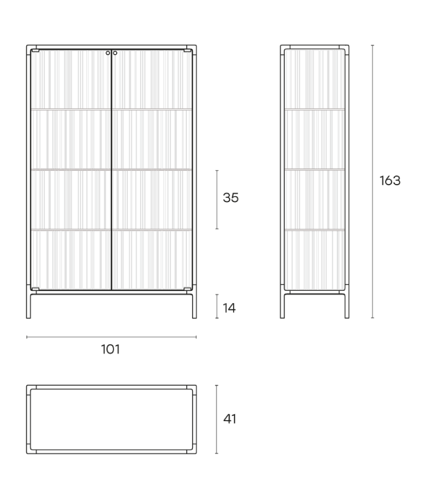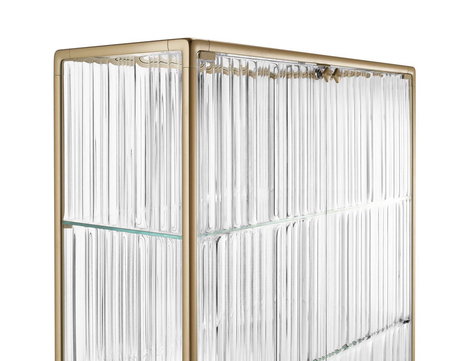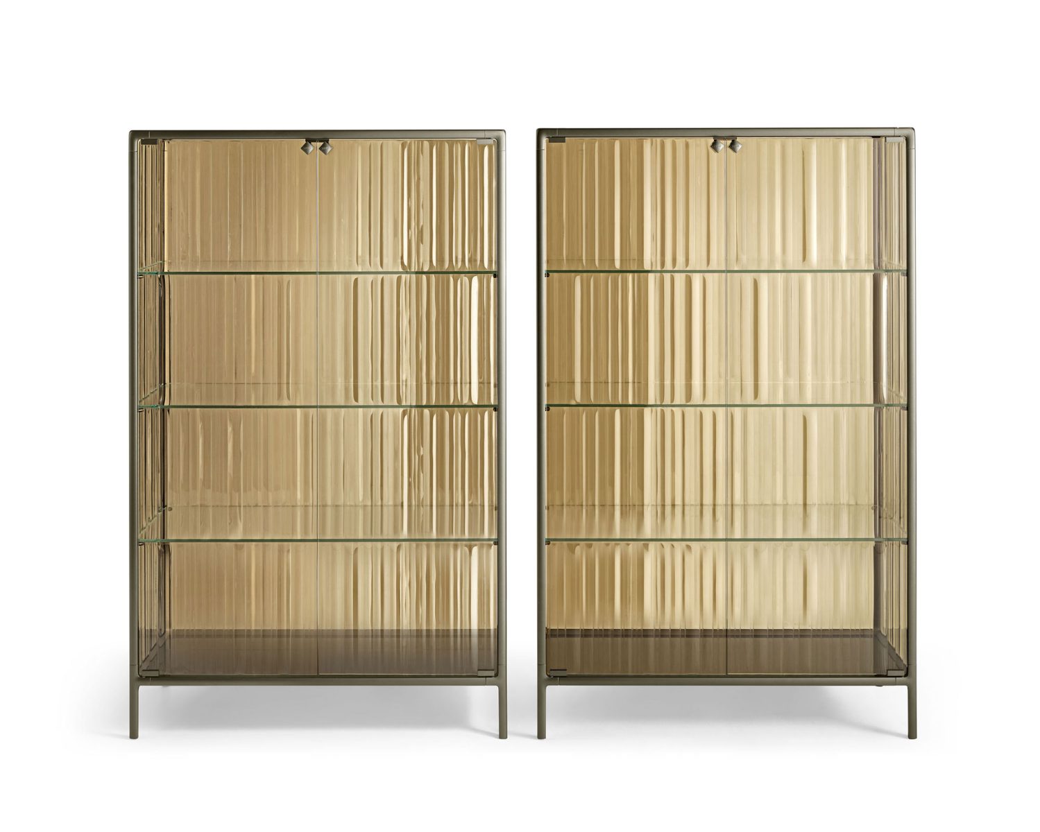 Base in vetro extralight da 6 mm temperato retroverniciato in tinta con la struttura; corpo vetrina ed ante in vetro extralight, fumé o bronzo da 6 mm fuso a gran fuoco e temperato; ripiani in vetro extralight da 8 mm temperato.