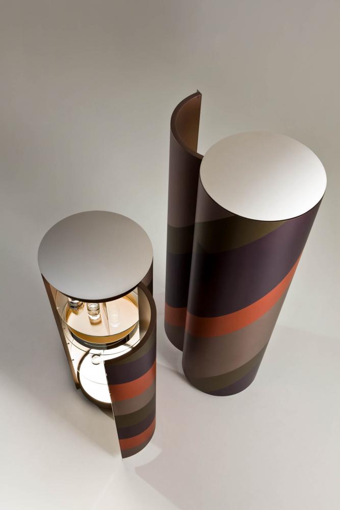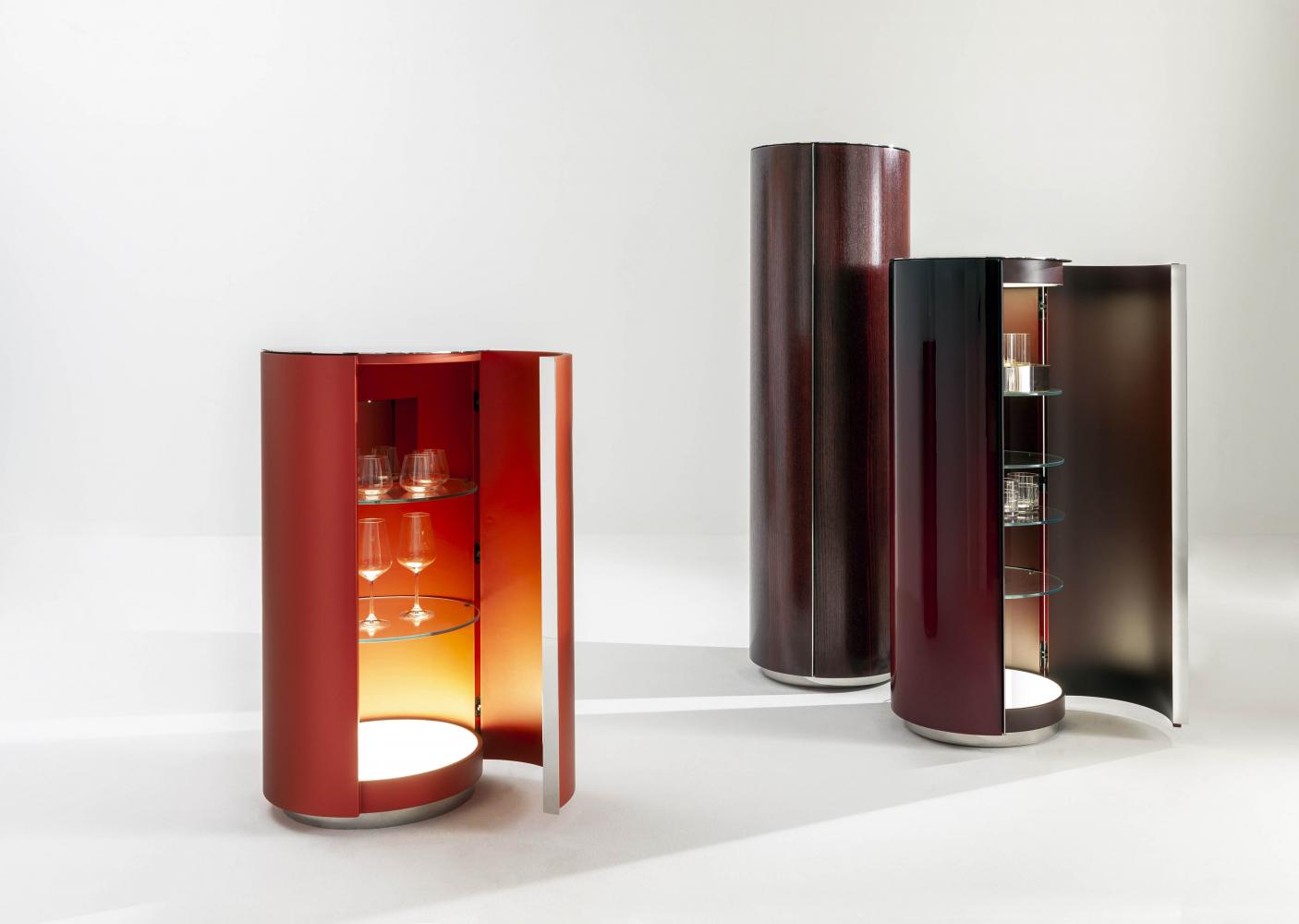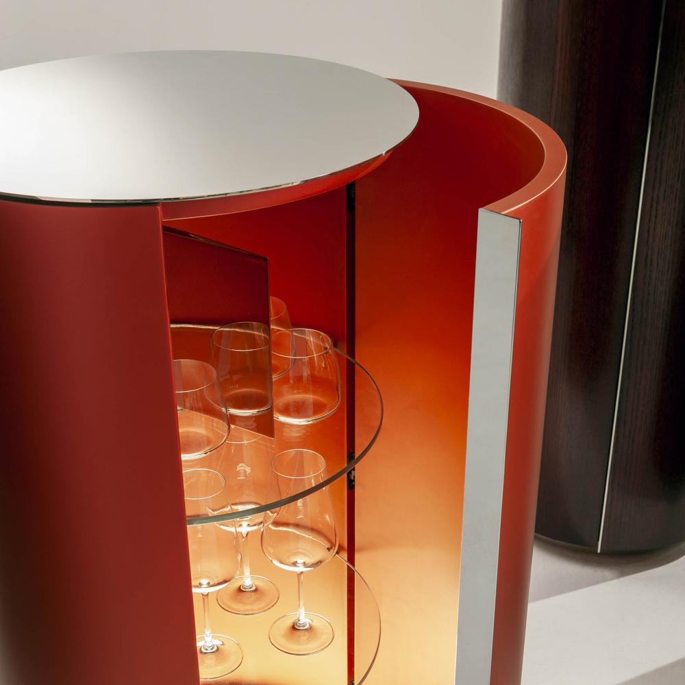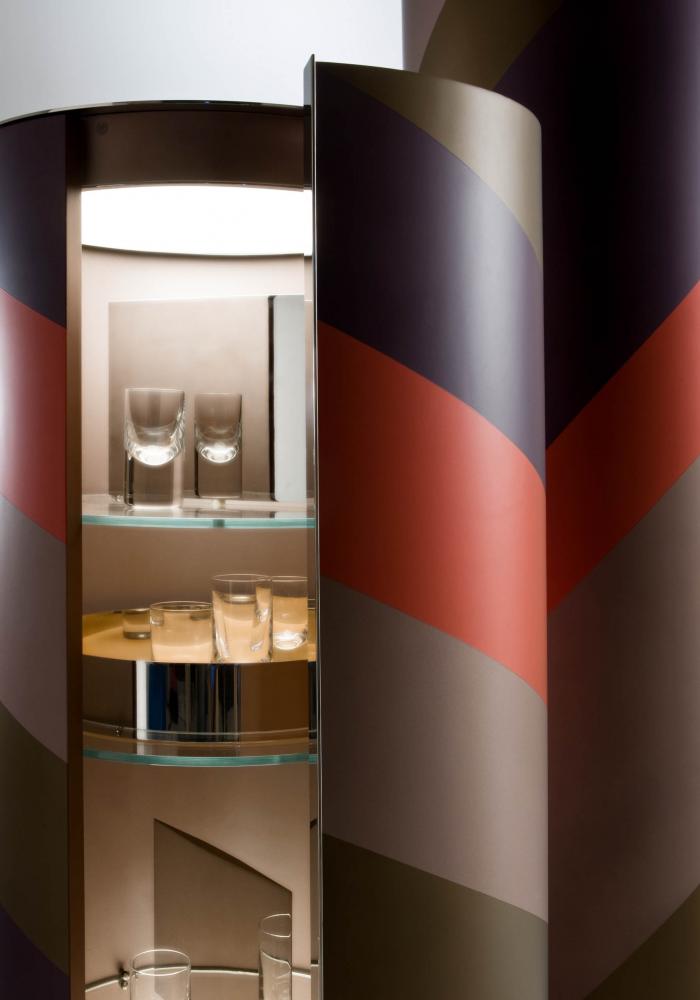 "Tango" is a set of containers born from the research on the counterpoint of proportions, diagonals and volumes. The two rhythms of helical bands that surround the cylinders are inspired by the mooring poles of the boats on Lake Como. The containers enclose an internal organization in circular glass tops, with mirror-polished steel accessories that multiply the geometries in a game of reflections.
