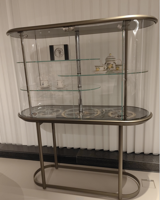 Bar con struttura e ripiani in vetro extrachiaro. Fondo,coperchio e basamento in finitura Bronze. Inserto top in MarmoReflex o LegnoReflex. Due ante con apertura sincronizzata tramite gli ingranaggi a vista in finitura oro e cromo lucido su fondale in vetro Mesh. Edizione numerata.