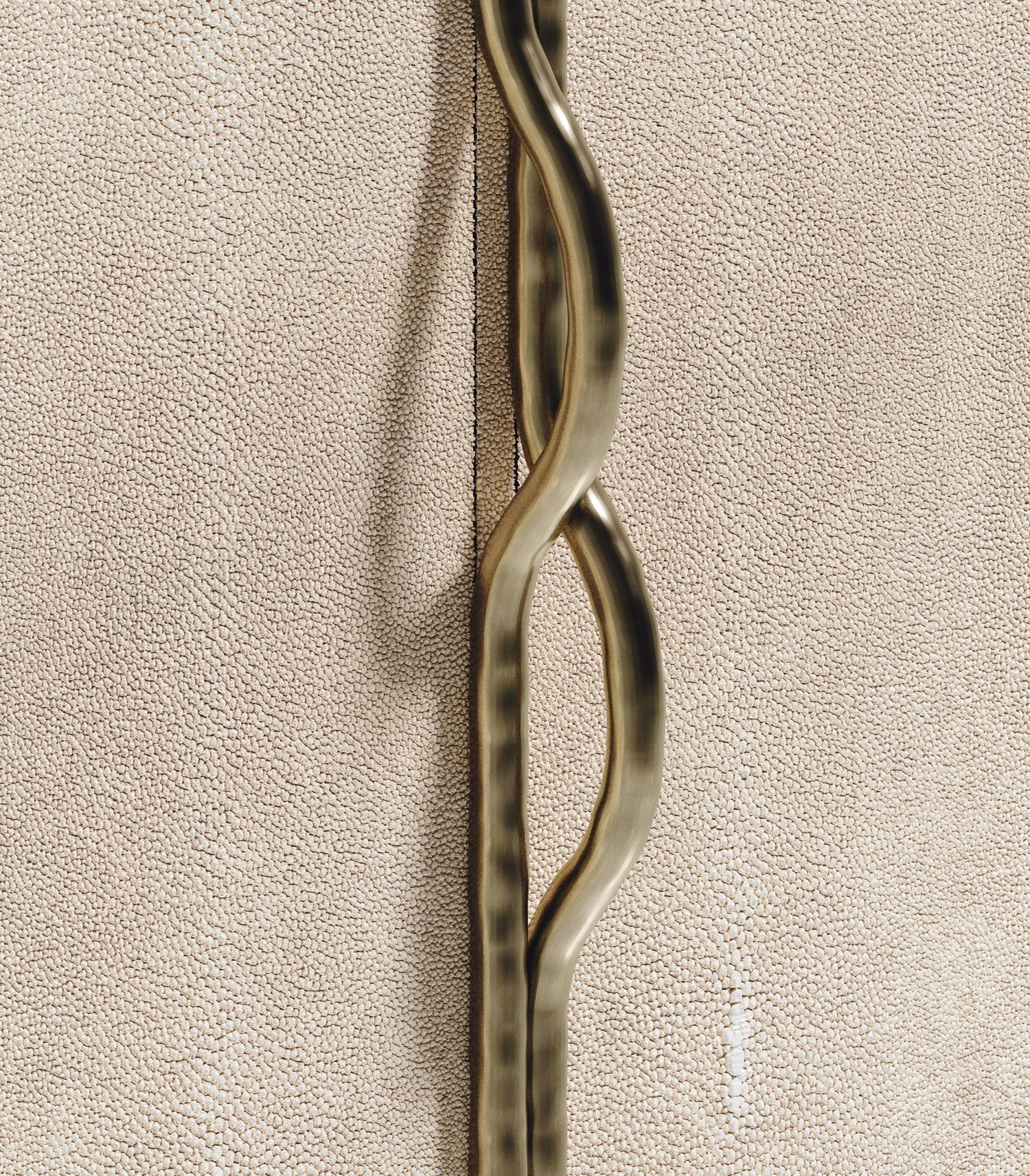 The Arianne bar cabinet by R&Y Augousti is one of a kind statement piece. The overall piece is inlaid in cream shagreen accentuated with intricate bronze-patina brass details that have the signature Augousti "melting" effect. The interior of the piece is in wood veneer and opens to 3 shelves. This piece is part of the Arianne Capsule.