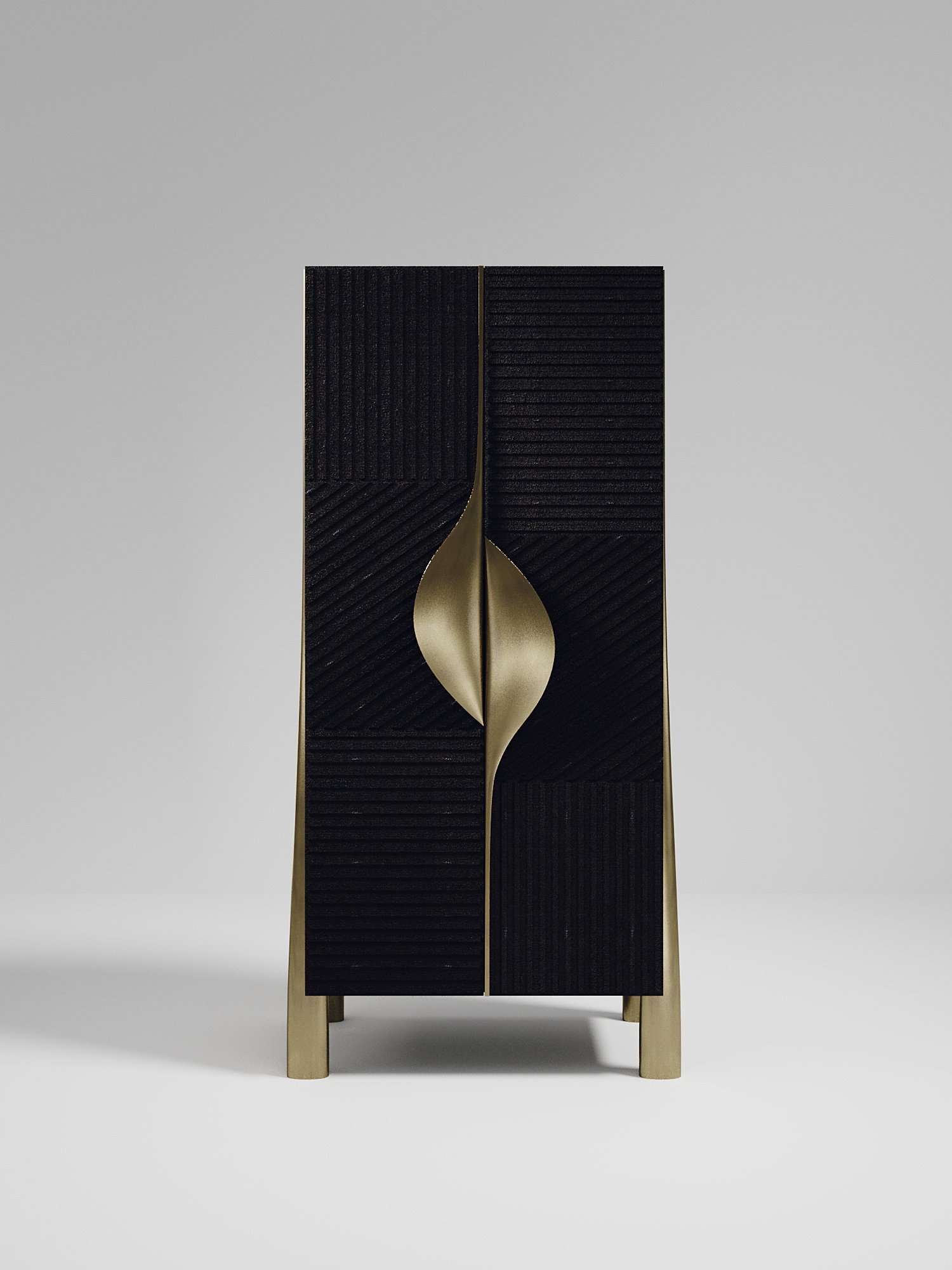 The Wave Bar Cabinet by R&Y Augousti is one of a kind statement piece. The overall piece is inlaid in coal black shagreen, with the exterior hand-carved in an updated version of the signature Augousti "rhomboid" pattern. The door handles and legs are in a bronze-patina brass. The interior of the piece opens up to an ultra luxe bar. The interior includes a back wall lined in a mirror, a flap top compartment in shell, bronze-patina brass shelving and shagreen drawers. The walls are in gilded-gold. Available in other finishes and as a vanity cabinet