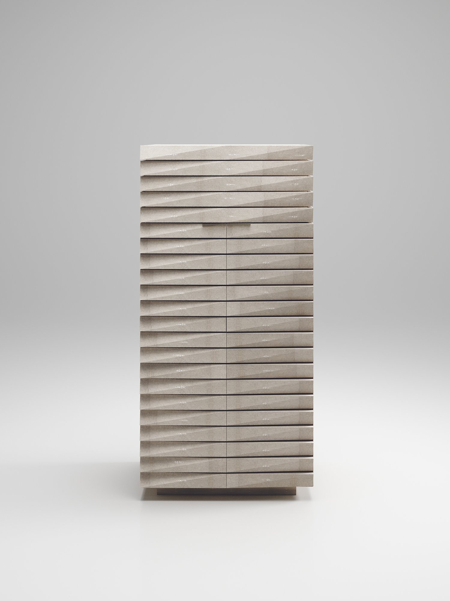The fluted bar cabinet by R & Y Augousti is a sleek and geometric design. The cream shagreen inlaid piece provides great utility while retaining a striking aesthetic with the incredible hand craved fluted details. This piece can be used as a bar cabinet or a jewellery vanity cabinet. This design includes a mirror, 3 open shelves and a a compartment beneath the flap open mirror with a flat bronze-patina brass handle. Available as a chest of drawers, stool and cabinet.