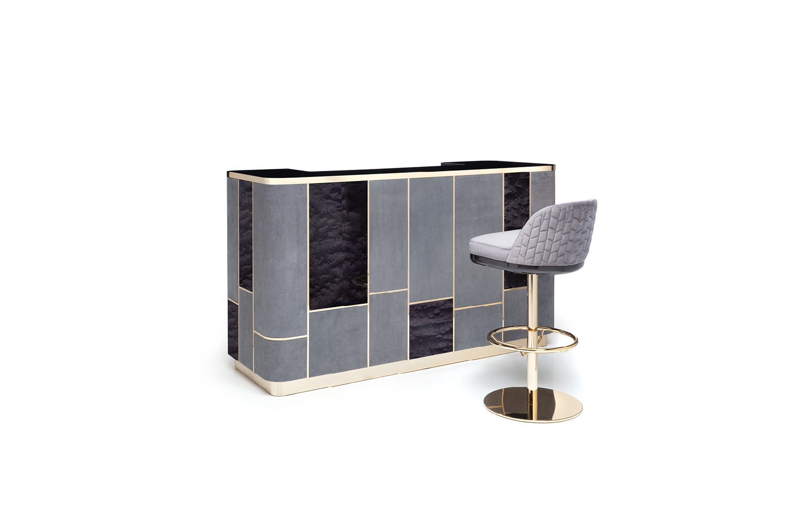 Bar with fronts in combination of Black Bubinga burl veneer with high gloss polyester finish and grey nubuk color nr 6. Details and base in light gold chrome stainless steel. Tops in smoked tempered glass.