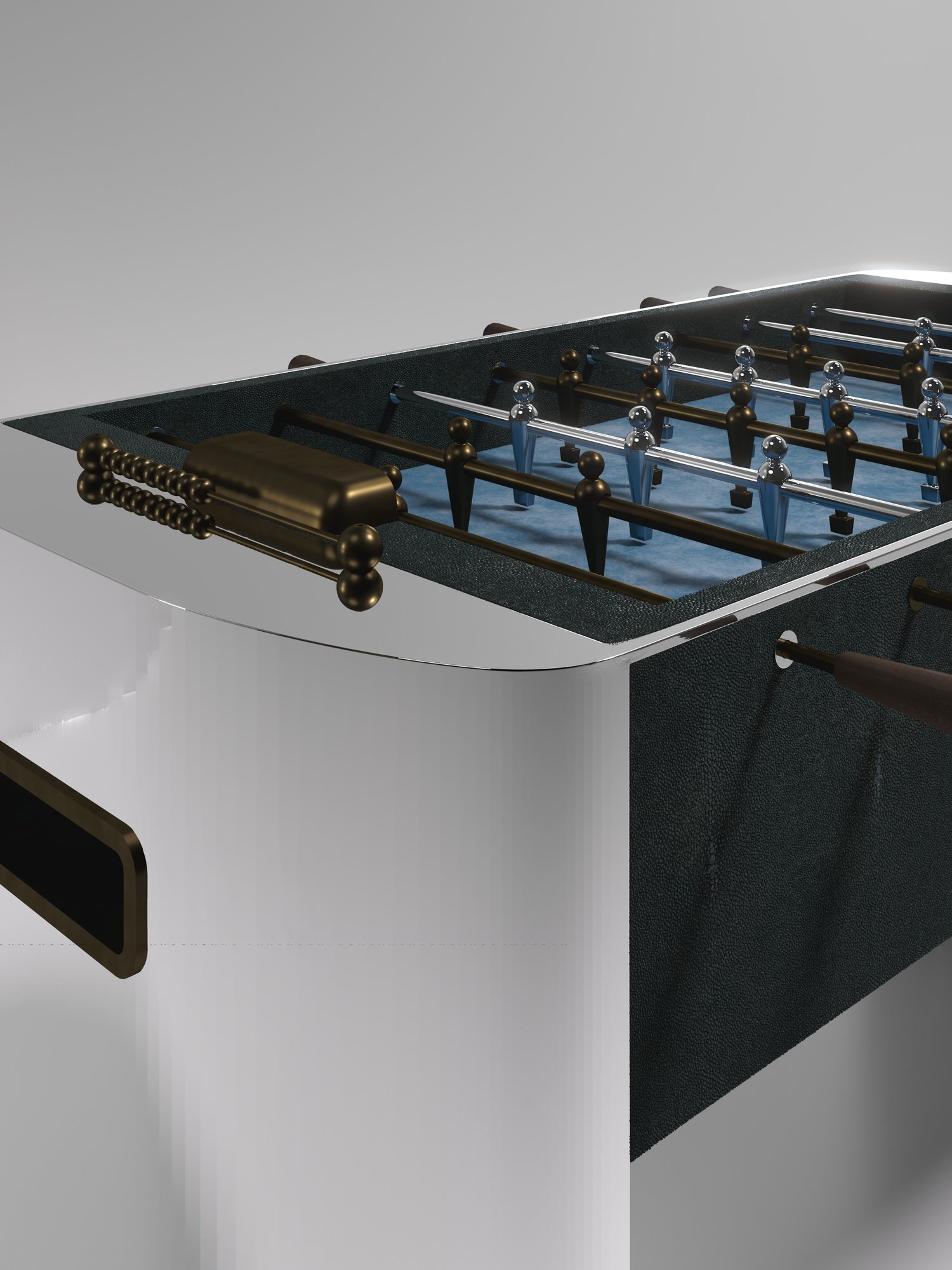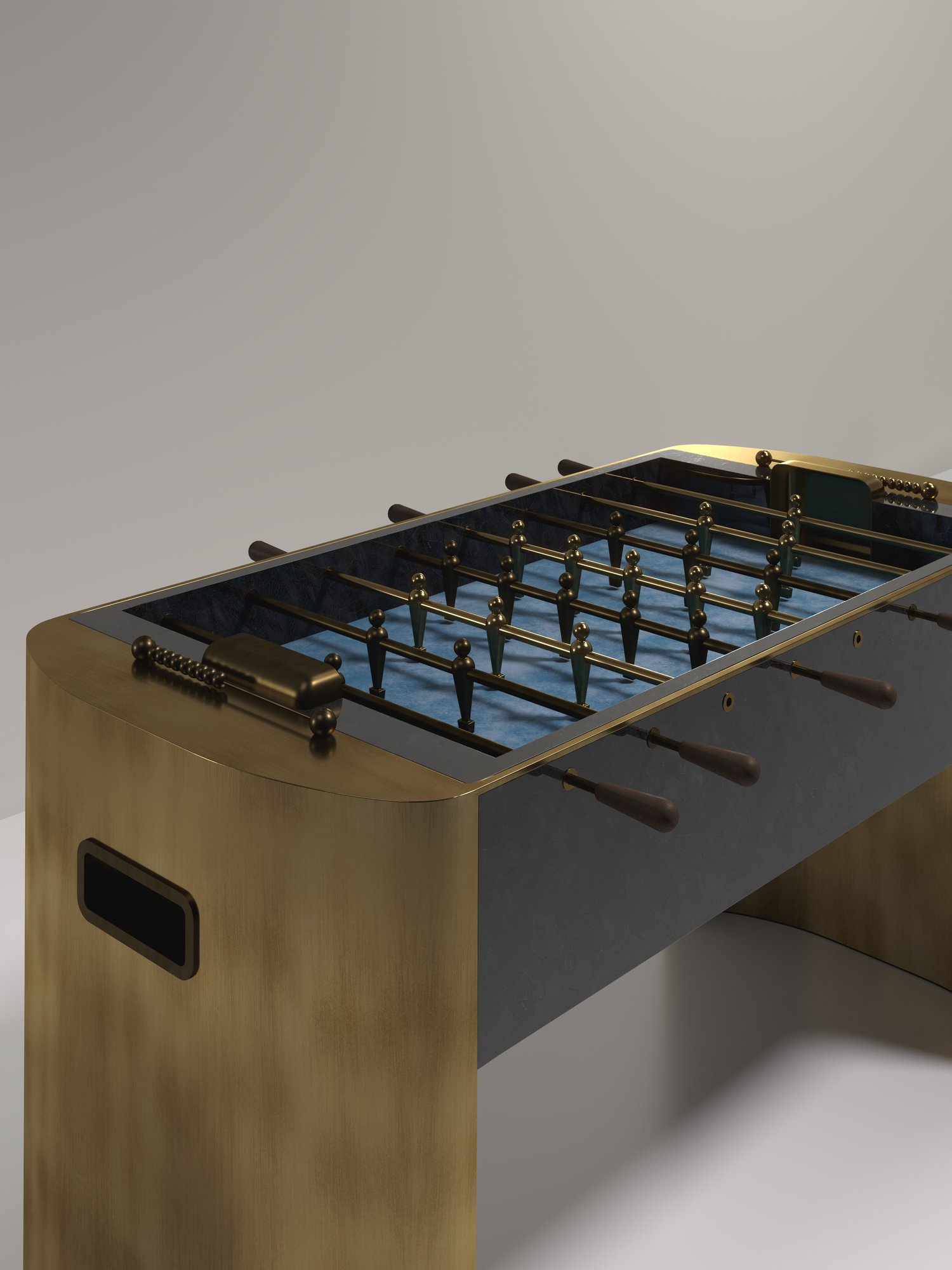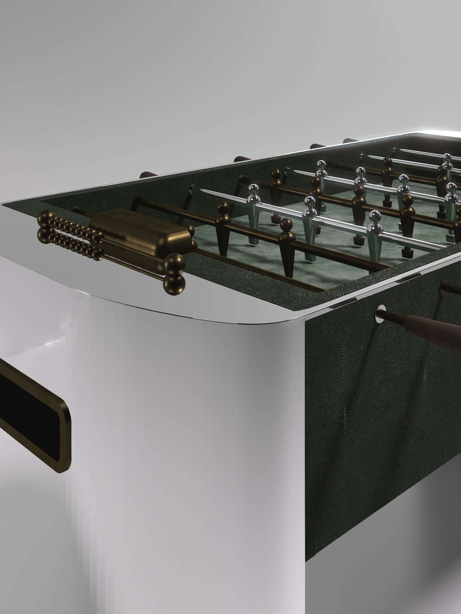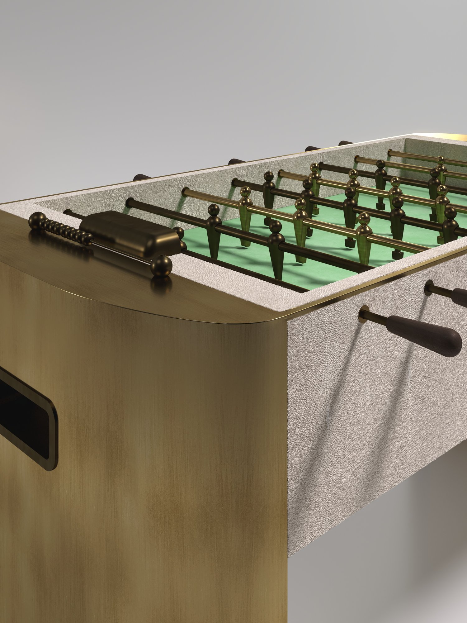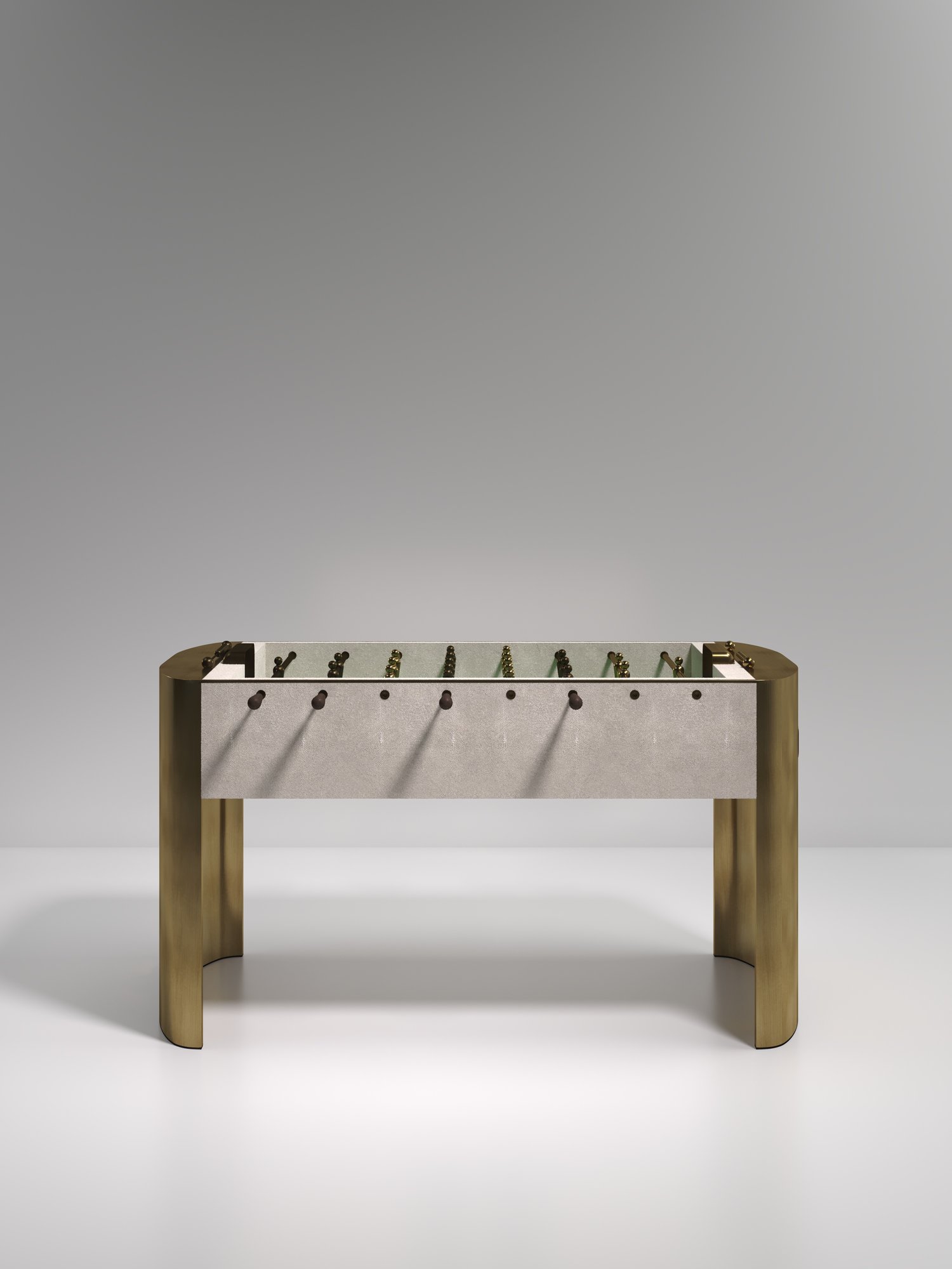 The Ellipse Foosball Table by R&Y Augousti is a truly luxurious statement piece for your home. The central cream shagreen game part is nestled in between stunning curved bronze-patina brass legs, creating the ultimate luxury game table. The foosball pieces are all in brass and inner table in a green velvet felt. Available in other finishes and variations.