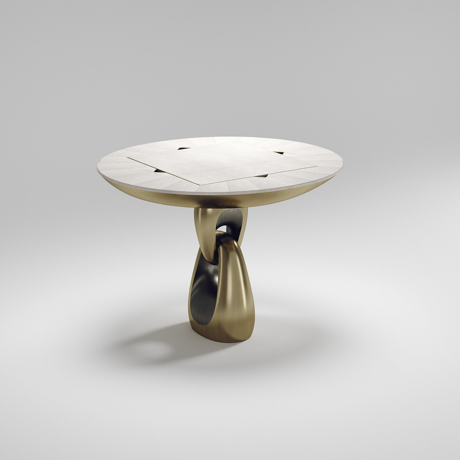 The 4 in 1 Saturn game table R&Y Augousti is a truly luxurious statement piece for your home. The clean lines of the overall piece in black or antique natural shagreen, accentuated by the sculptural and sleekchrome finish polished stainless base make it versatile for any space. This piece includes a complete game package set with interchangeable boards that stack on top of each other in the centre of the table; one for chess, one for backgammon backgammon, a green velvet bard to play your favourite card games and a plain shagreen board if one were to use it as a beautiful centre piece.