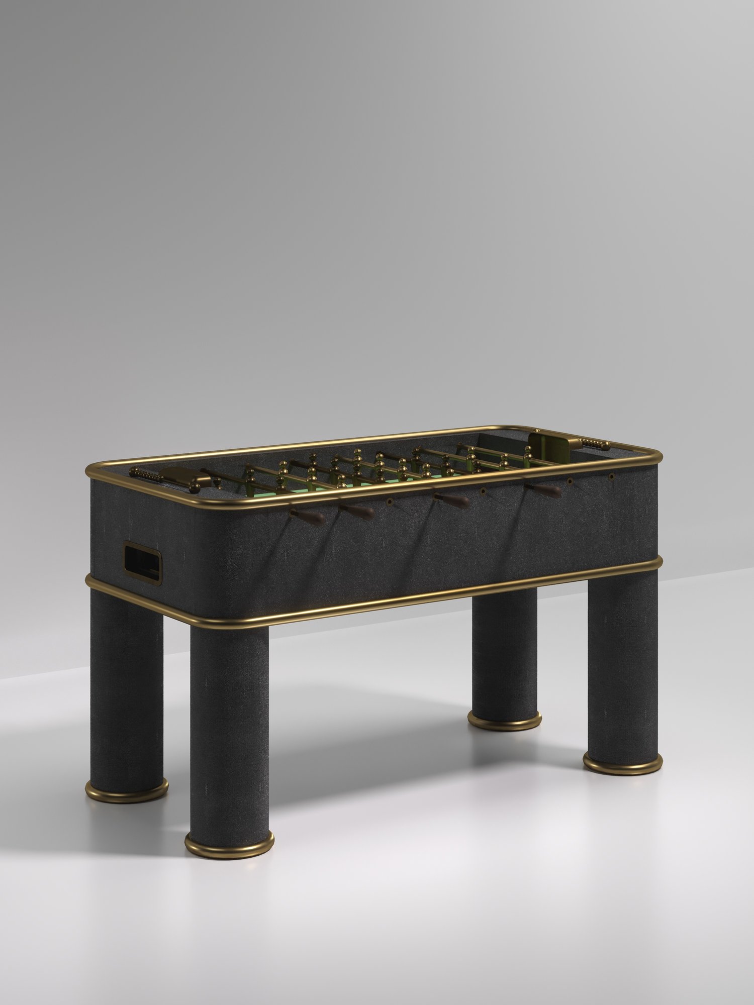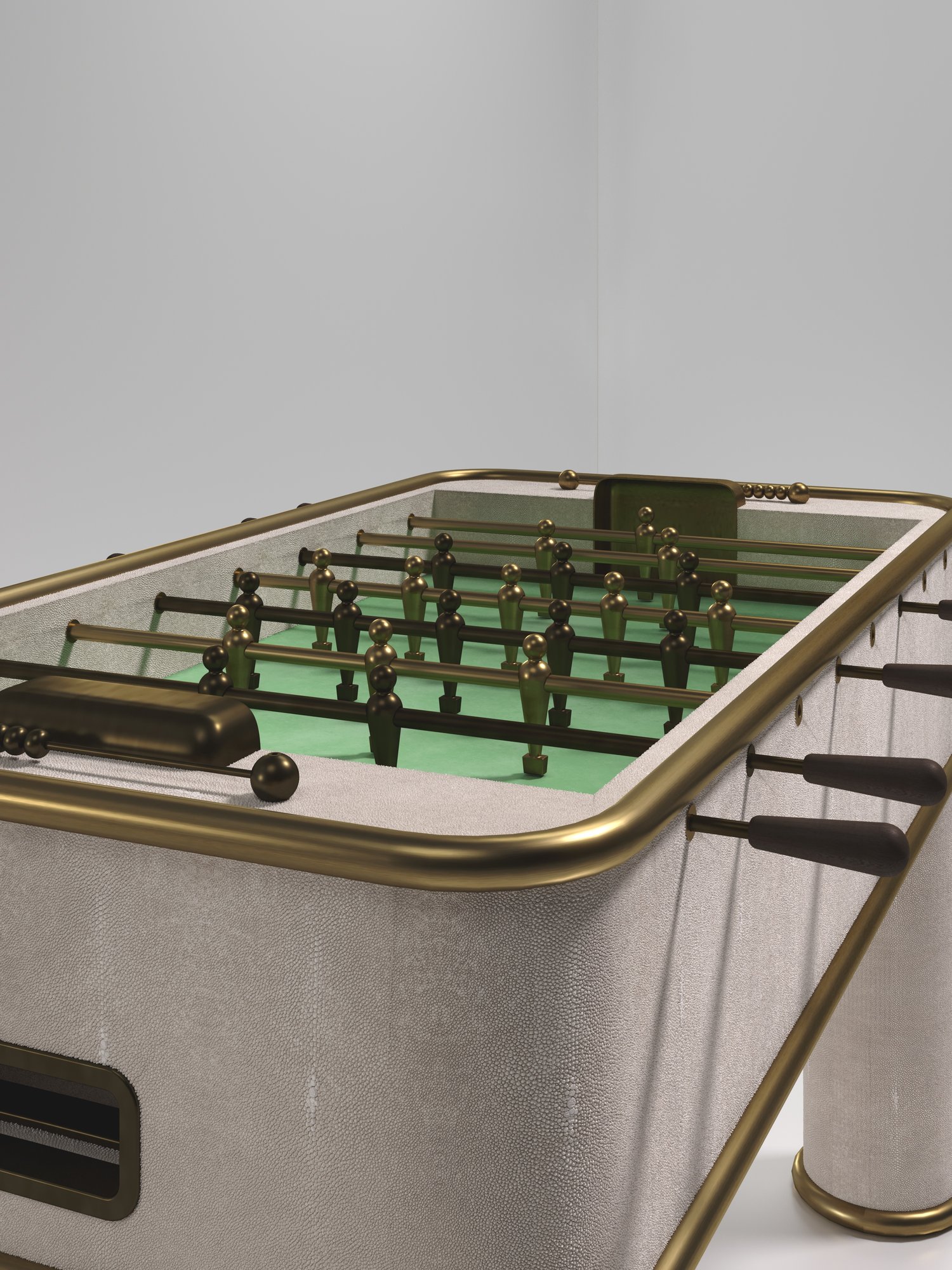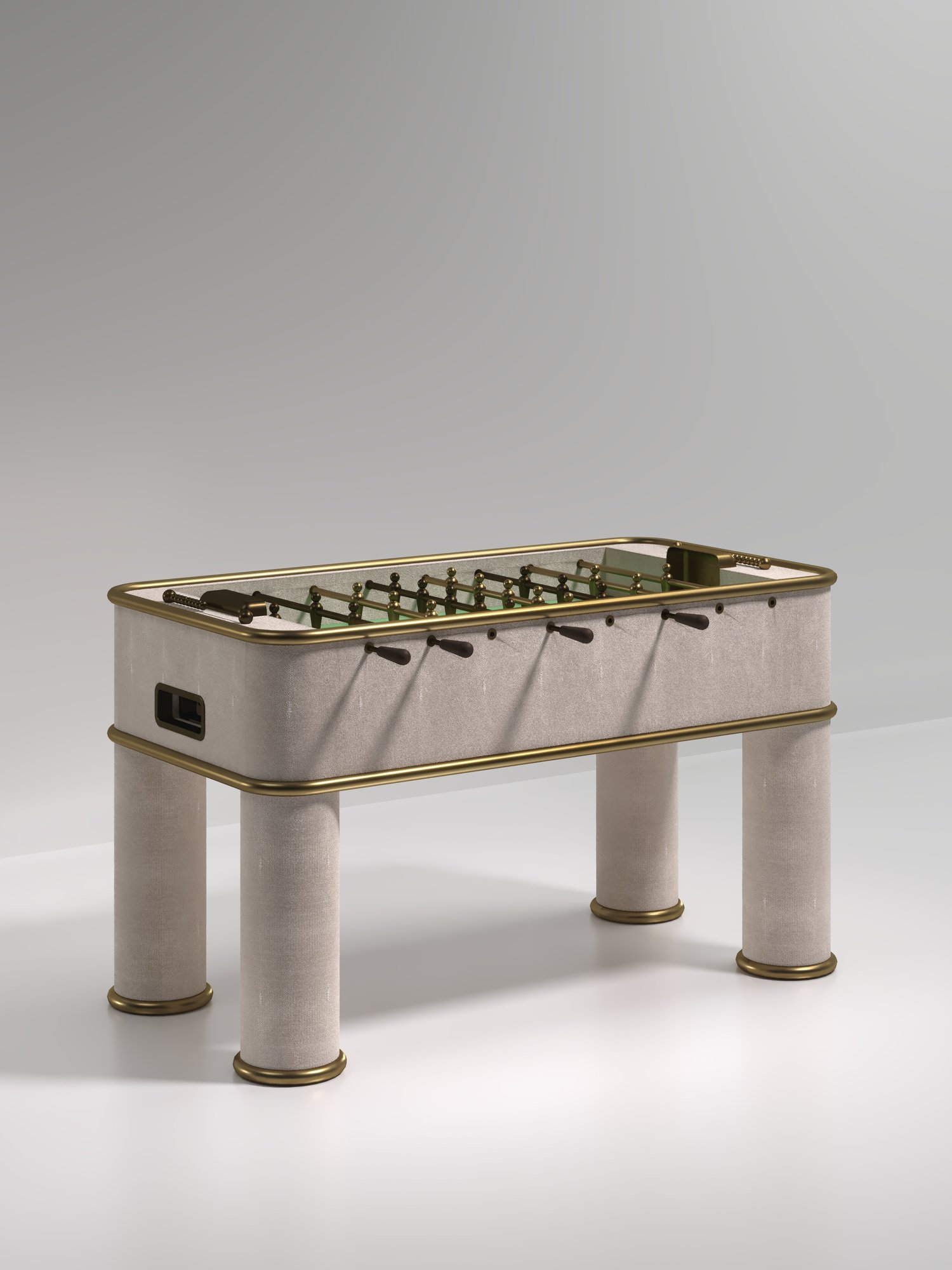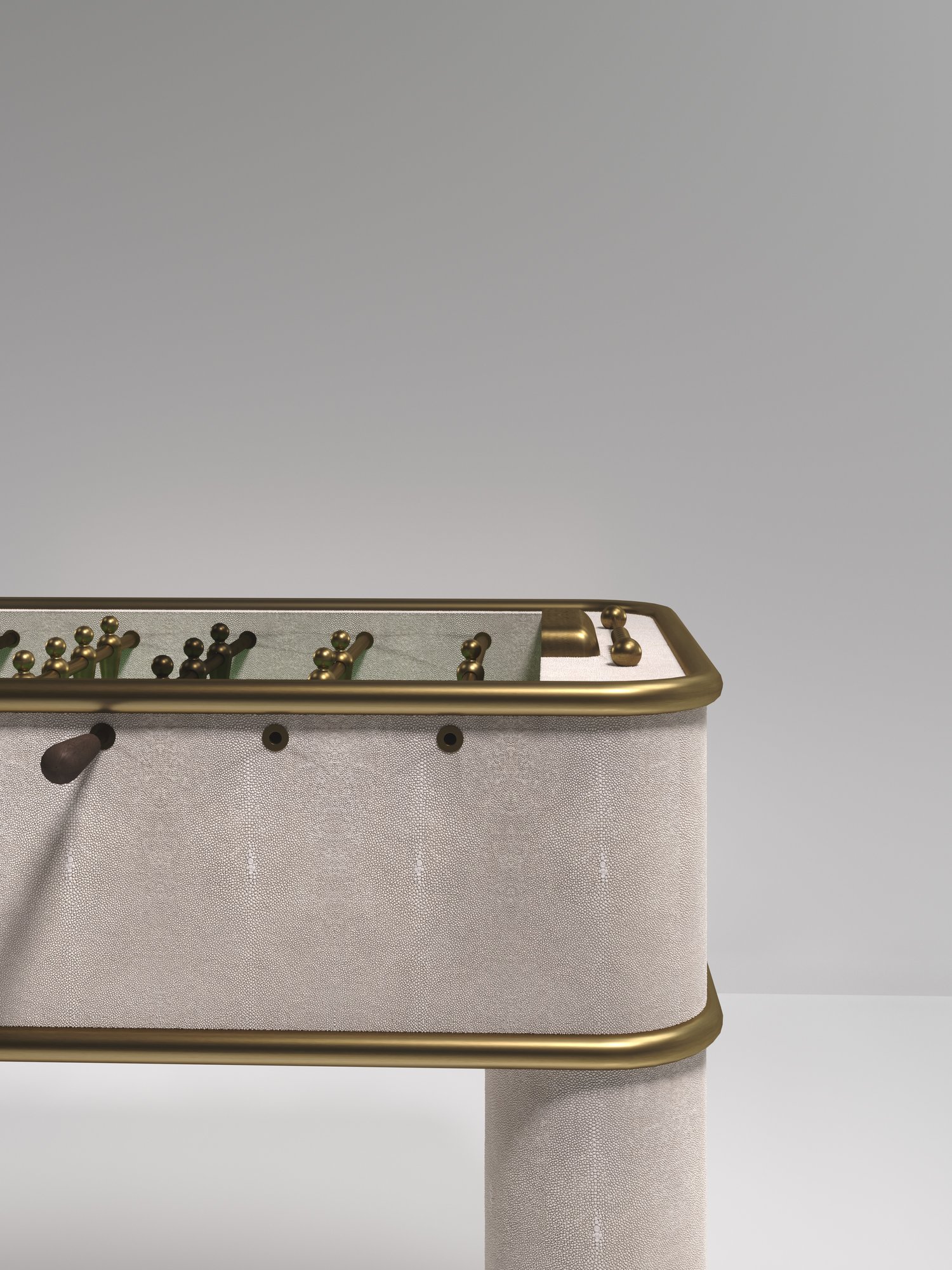 The Ring Foosball Table by R&Y Augousti is a truly luxurious statement piece for your home. The clean lines of the overall piece in cream shagreen, accentuated by the sleek bronze-patina brass piping detail makes it the ultimate luxury game table. The foosball pieces are all in brass and inner table in a green velvet felt. Available in other finishes and variations.