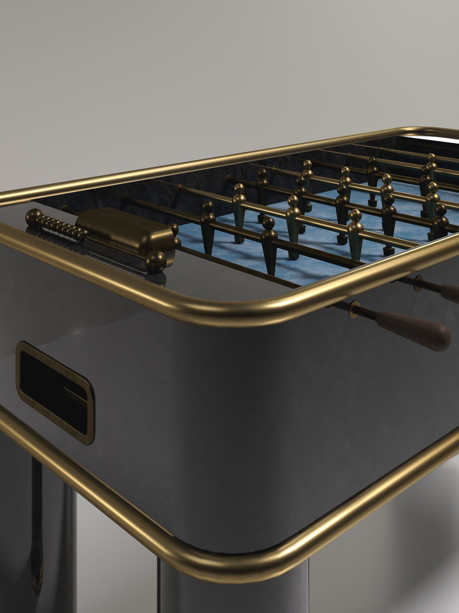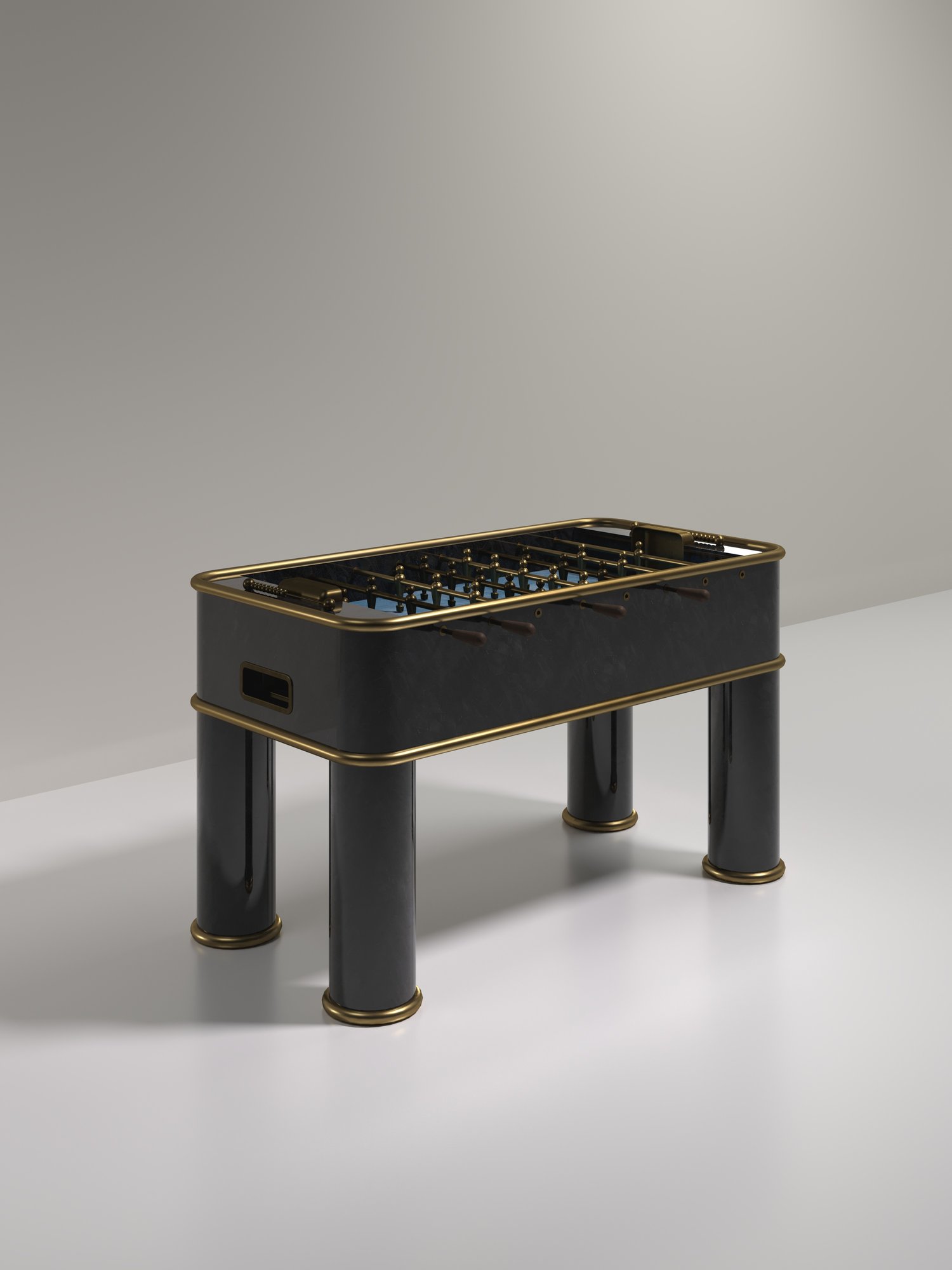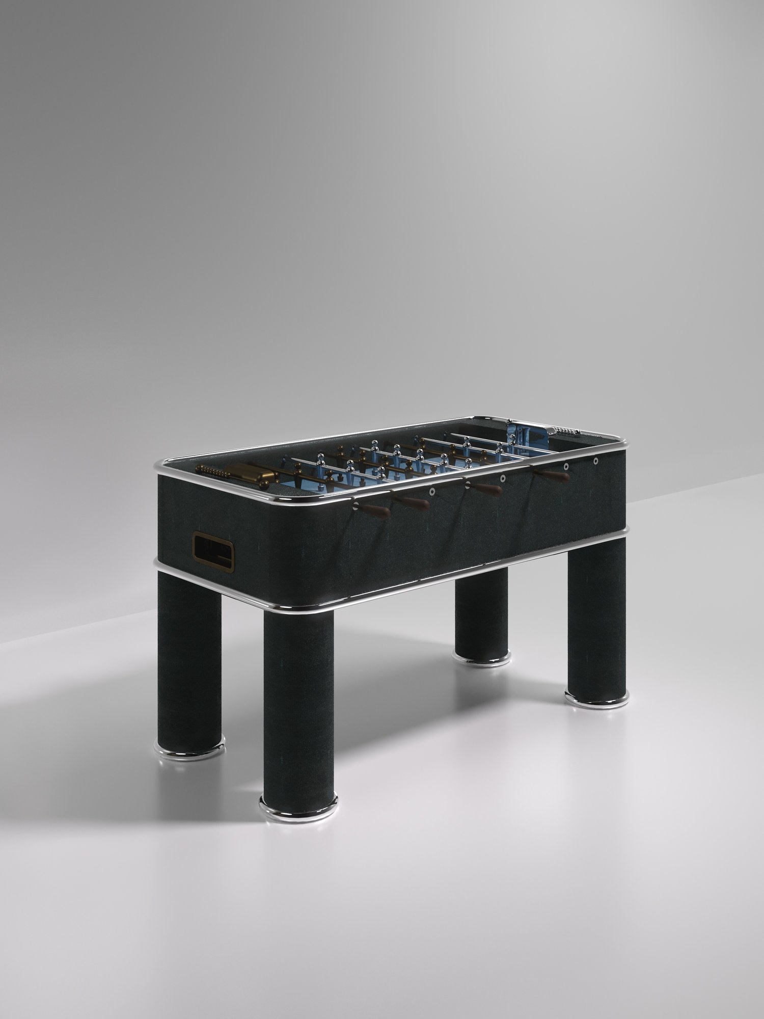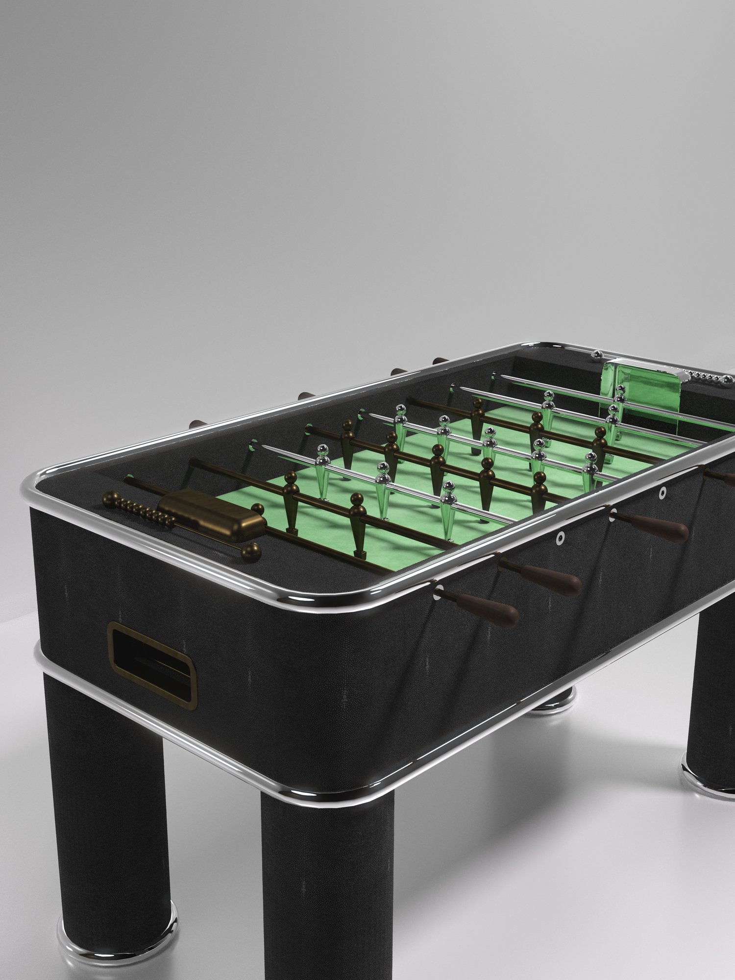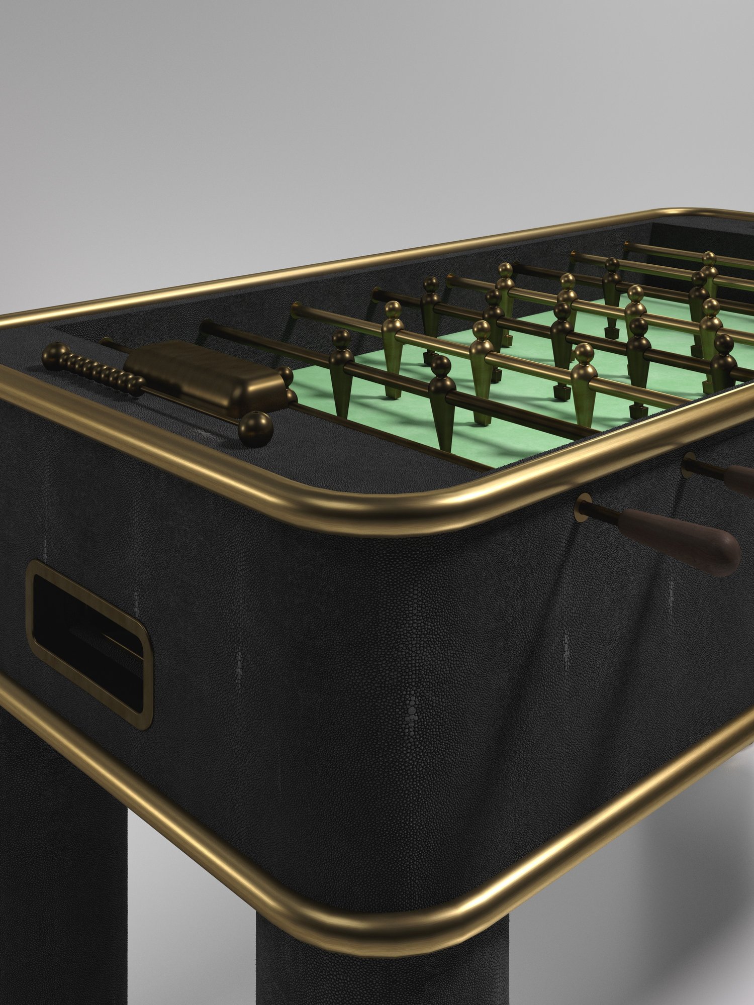 The Ring Foosball Table by R&Y Augousti is a truly luxurious statement piece for your home. The clean lines of the overall piece in cream shagreen, accentuated by the sleek bronze-patina brass piping detail makes it the ultimate luxury game table. The foosball pieces are all in brass and inner table in a green velvet felt. Available in other finishes and variations.