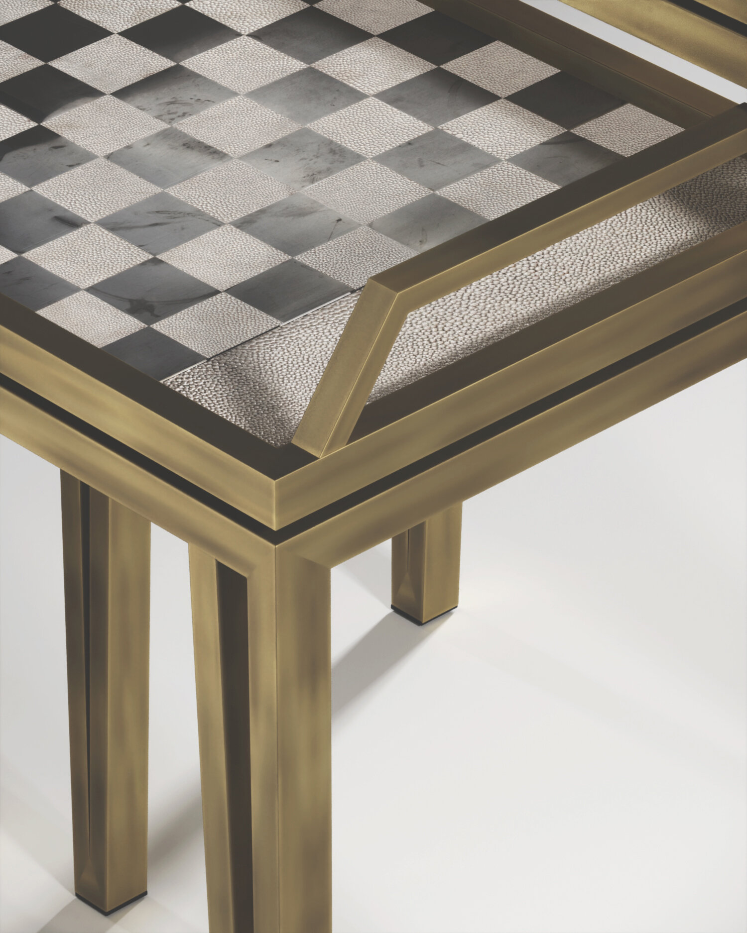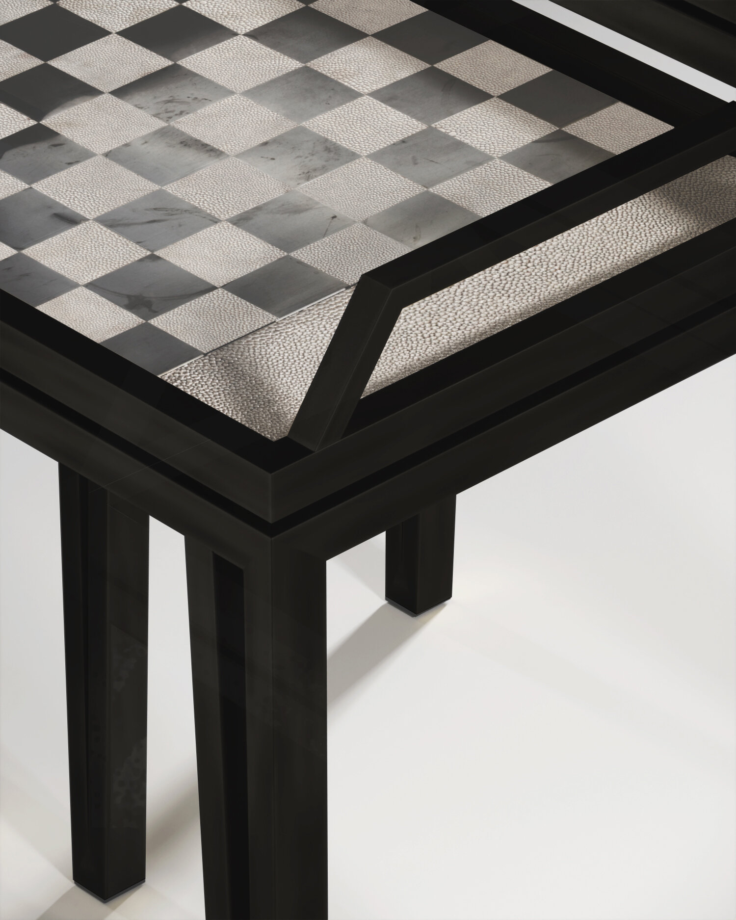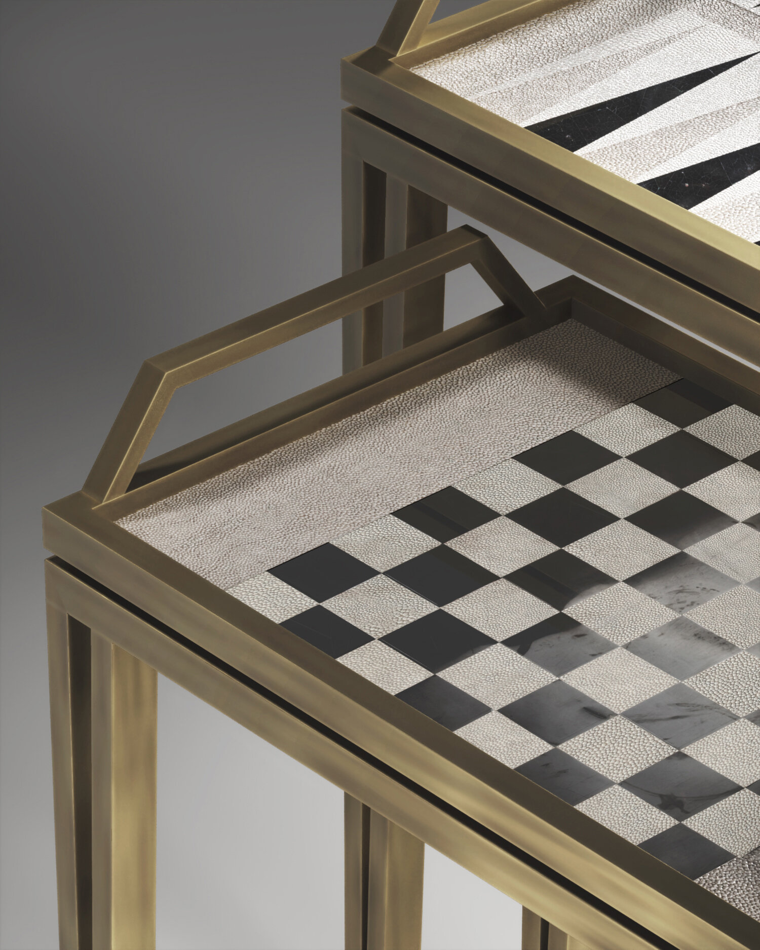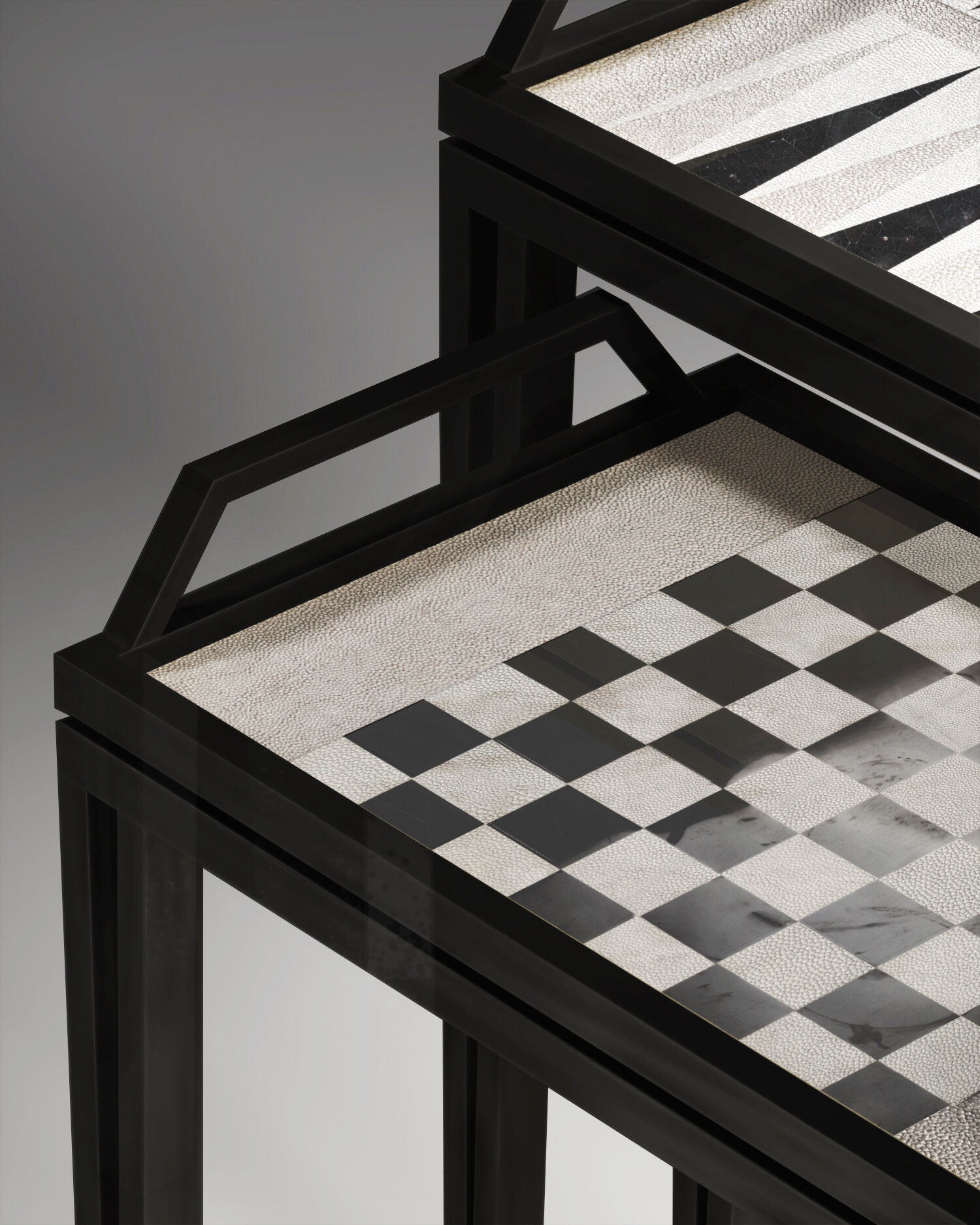 The set of 2 nesting game tables by R&Y Augousti inlaid in a mixture of cream shagreen, black pen shell and brass are the ultimate luxury piece of furniture. The larger size is for backgammon and the smaller nesting size for chess. Each tabletop is a removable tray to allow versatility to the overall piece. Sold with all game chips and accessories needed for chess and backgammon. Tables can be purchased individually on request. Also available in black metal. Also done as a plain shagreen side table.