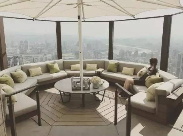 圖中,天王嫂昆凌,舒適地躺在360度景觀臺(tái)旁的沙發(fā)上,享受著陽(yáng)光與美景。