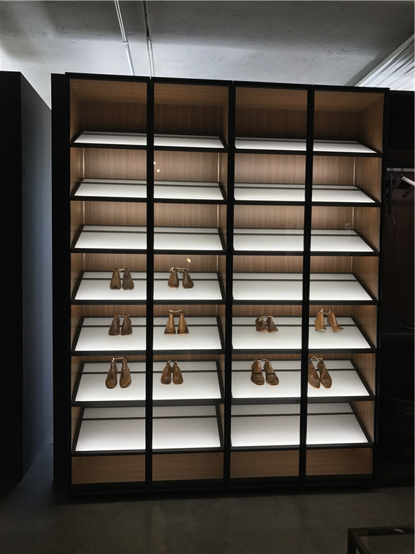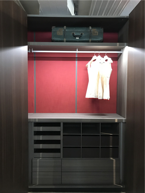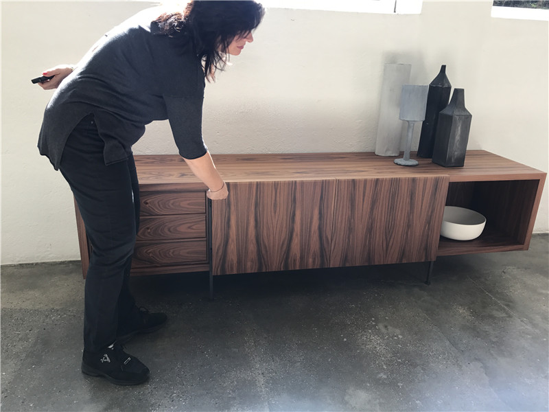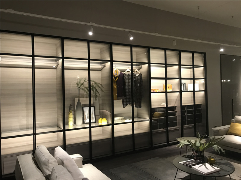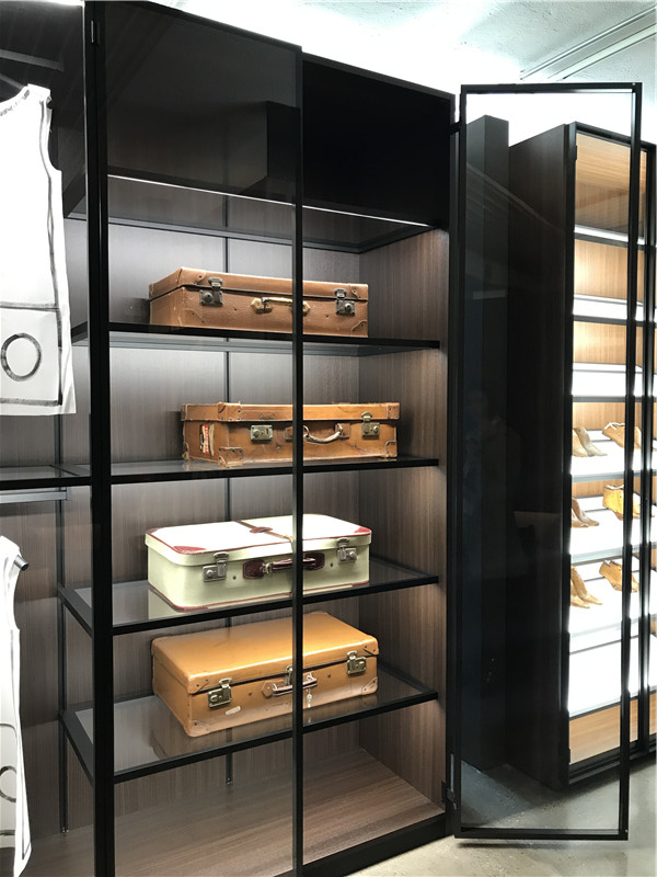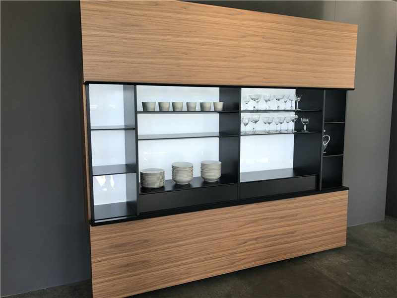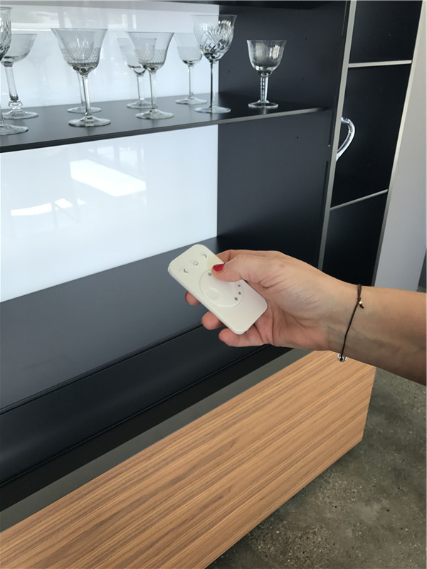 下圖的柜體,上下門可推開,這樣的設計,在不占用空間的情況下,又使內部空間大,且內部的燈光可遙控調節。