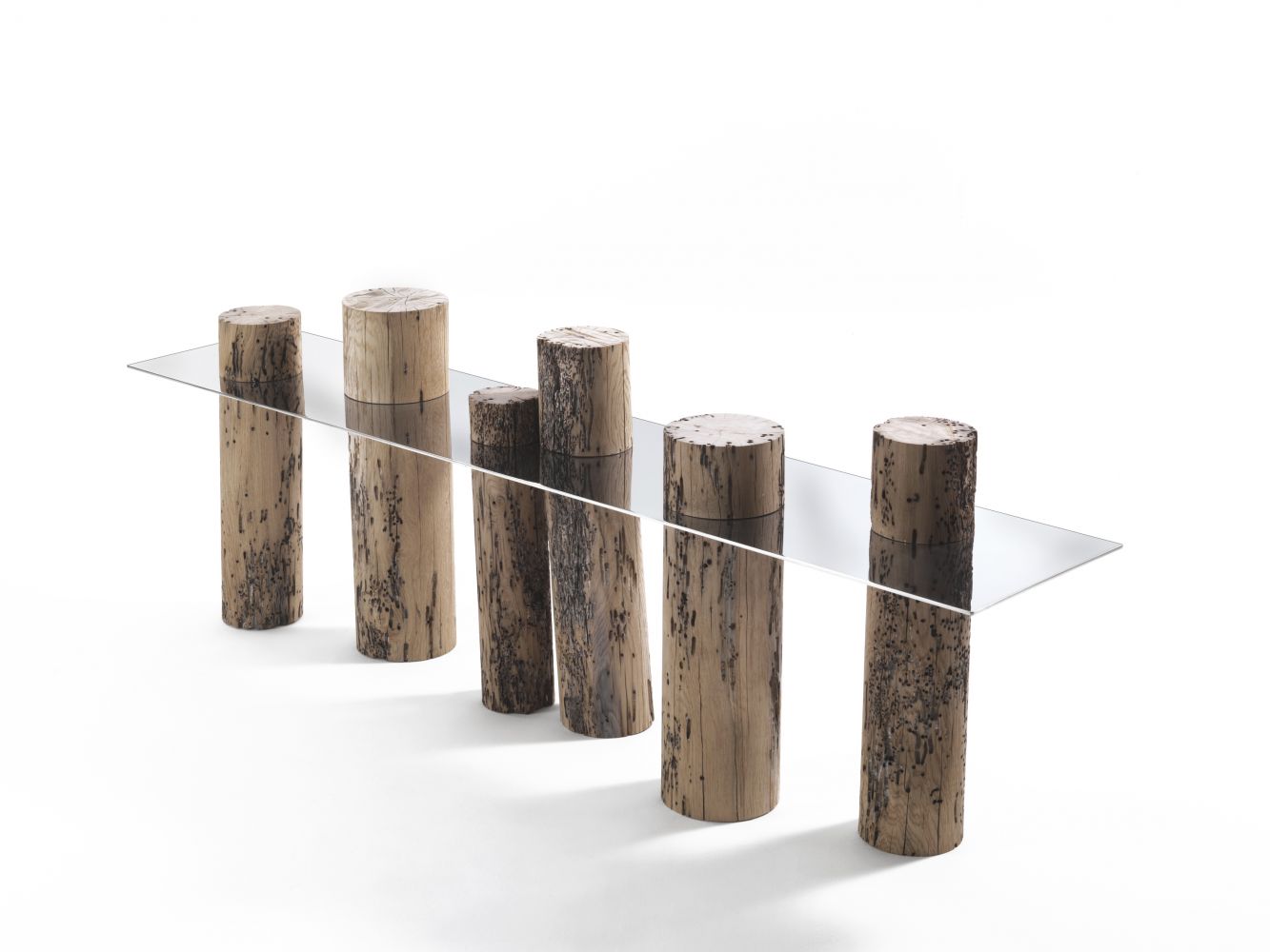 同樣兩根威尼斯橡木的木樁,設(shè)置于玻璃桌面的底部,似水面的透明玻璃桌面隱隱泛著藍(lán)光,猶如平靜的湖面倒映著木樁的形狀!