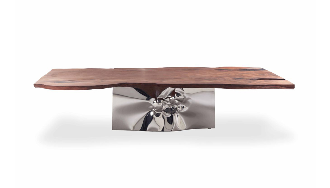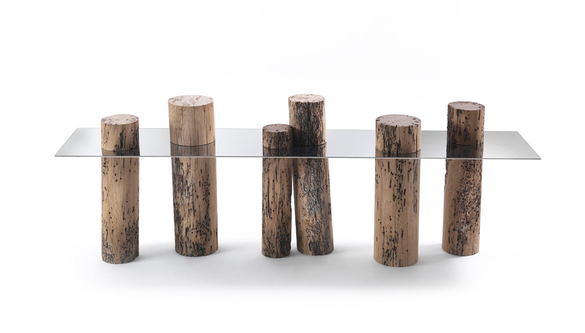 這是Riva1920用威尼斯橡木制作的具有標(biāo)志性的餐桌,它模仿木材一半淹沒(méi)于水中一半呈現(xiàn)在水面的景象,利用原始木料,設(shè)計(jì)了這一款與眾不同的餐桌。