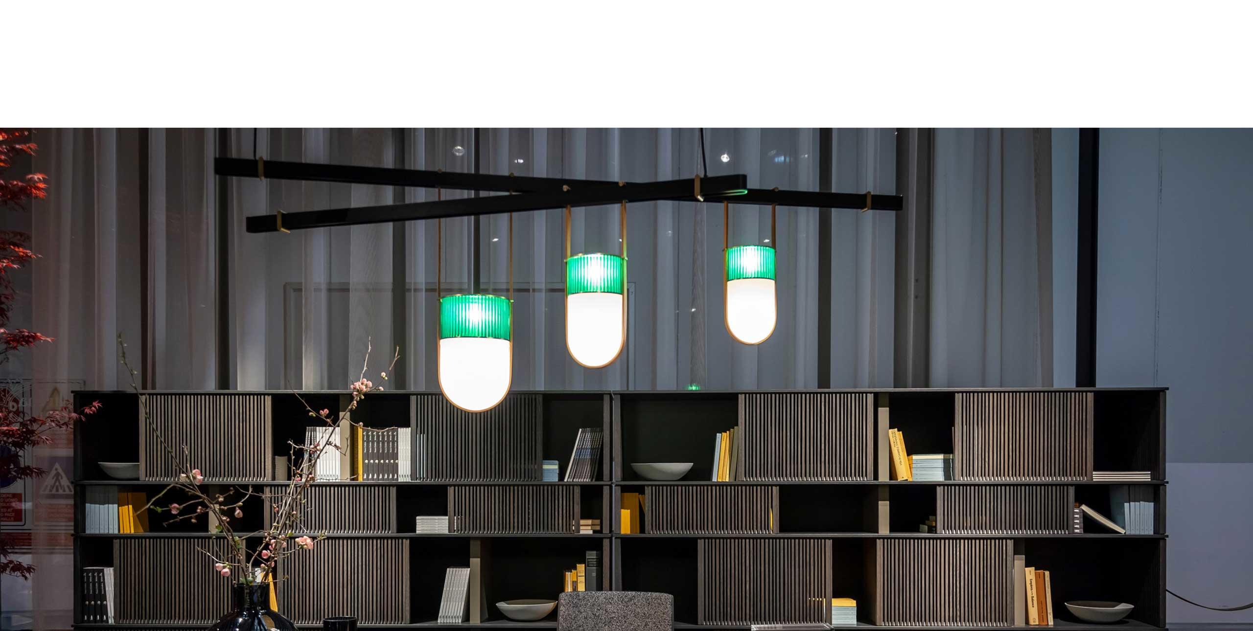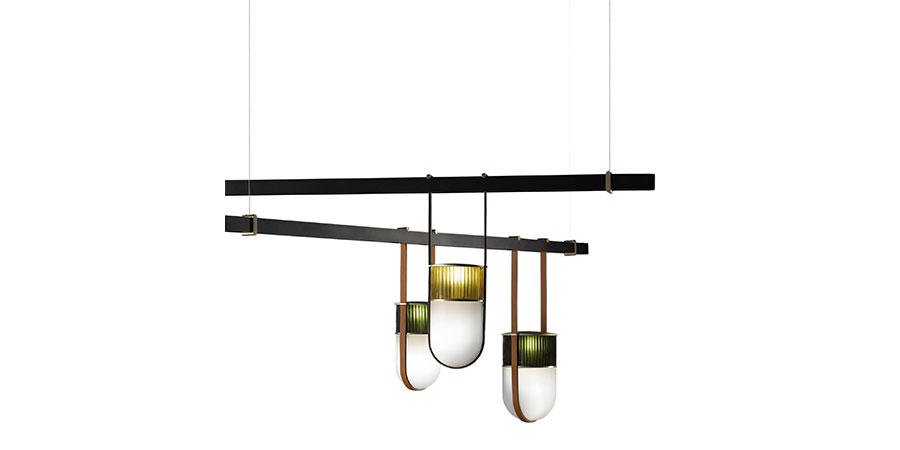 吹制的玻璃和馬鞍皮制成的燈線就像燈籠一般,使燈具的整體造型如純凈的線條和精致的材料對比,將吹制玻璃的兩種元素結合在一起,上部玻璃有一個特別均勻的表面,是透明的陰影琥珀(祖母綠、藍寶石或月亮石),下半部分由一部分珍珠制成,只為讓光線更溫暖更加發散!