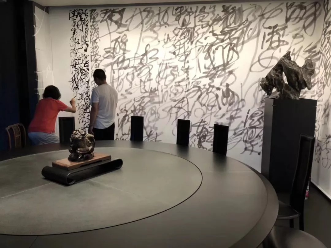 圖中正在為墻壁題字的正是王冬齡老師,作為著名書(shū)法家、中國(guó)美術(shù)學(xué)院教授、中國(guó)書(shū)協(xié)理事、浙江省書(shū)協(xié)副主席、中國(guó)書(shū)法進(jìn)修學(xué)院副院長(zhǎng),他的巨幅狂草,已經(jīng)超越了書(shū)齋的極限,筆墨完全被精神化,精神從具體的書(shū)寫(xiě)中抽象出來(lái),它們帶來(lái)的視覺(jué)體驗(yàn),更是一種情境,一種情懷。